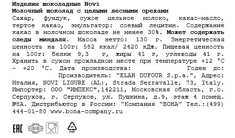 Сахар, фундук, молоко сухое цельное, масло какао, тертое какао, эмульгатор: лецитин соевый.