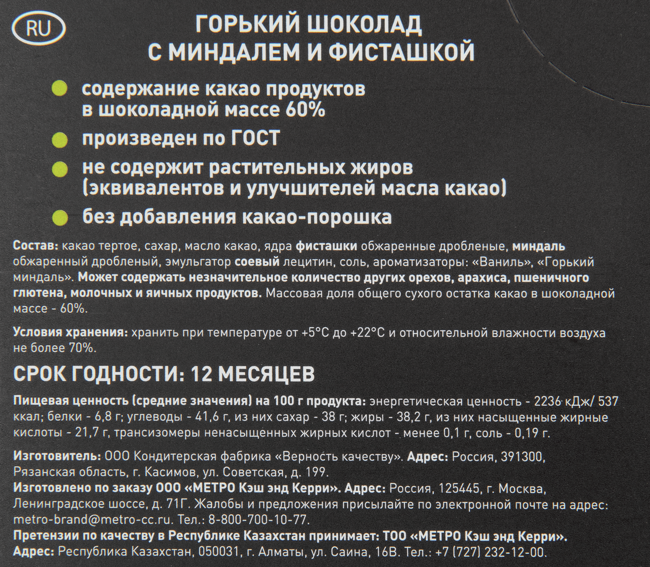 Какао тертое, сахар, масло какао, ядра фисташки обжаренные дробленные, миндаль обжаренный дробленый, эмульгатор соевый лецитин, соль, ароматизаторы Ваниль, Горький миндаль.