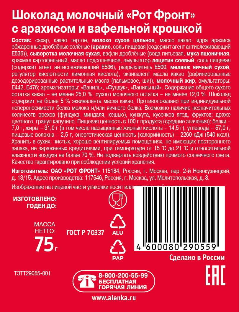Шоколад Рот Фронт молочный арахис и вафельная крошка, 75г