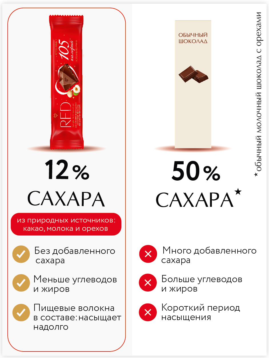 Red - легкий и нежный молочный шоколад без сахара. Сочетание фундука и макадамии открывает новый вкус для ценителей настоящего удовольствия. В аромате нотки обжаренных орехов, во вкусе – нежность молочного шоколада. Теперь в удобном формате батончика - удобно взять с собой на перекус. А еще Red это: меньше калорий, чем в аналогичном шоколаде других марок. Приятный вкус: отборное какао из Cte d’Ivoire и особая рецептура, благодаря которым вкус шоколада Red так ценят потребители. Red - как часть спортивного питания: в одном шоколадном батончике Red всего 105 ккал - удобно при подсчете калорий, он сладкий, но без сахара - идеально для читмила (планового нарушения диеты).