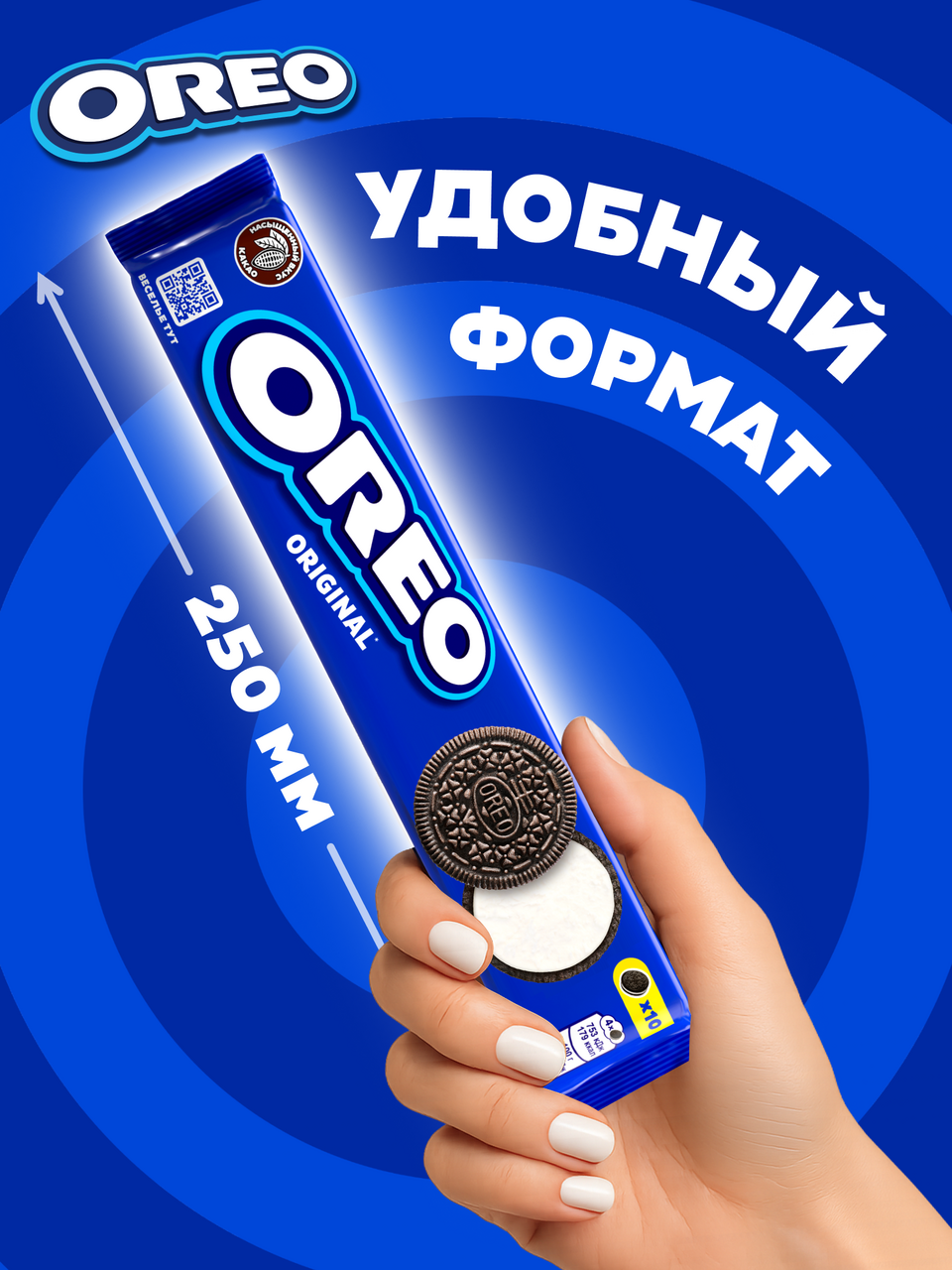 Участвует в конкурсе: Выиграйте кофемашину на сладкое! Совершите покупку товаров-участников на сумму от 1500₽ с 23 октября 2025г. по 14 января 2026г. и получите шанс выиграть кофемашину или другие сладкие призы! Чем больше покупок - тем больше шансов на победу! Подробнее об акции - https://cdn.metro-cc.ru/ru/mndlz_2025.pdf. Бисквитное печенье Oreo - хрустящее печенье с какао и нежной начинкой со вкусом ванили, которое любит весь мир. Взрослым и детям нравится забавный способ, которым едят Oreo: Покрути, Лизни, Обмакни. Попробуйте, это весело и очень вкусно. Печенье бисквитное с начинкой Oreo - вкусный перекус, который отлично сочетается с молоком и соком. Печенье порционное подойдет в качестве сладости к чаю или кофе, и его удобно съесть на завтрак, взять с собой в дорогу, взять в школу, в университет, на работу или на прогулку. Печенья Oreo идеально подойдут, чтобы сделать перерыв, побаловать себя, провести время с семьей, для просмотра фильма или сериала, для встречи с друзьями. Это отличный вариант сладкого угощения на праздник и на День рождения. Упаковка печенья с какао и начинкой с ванильным вкусом безусловно порадует и детей, и взрослых! Oreo - играй всегда.
