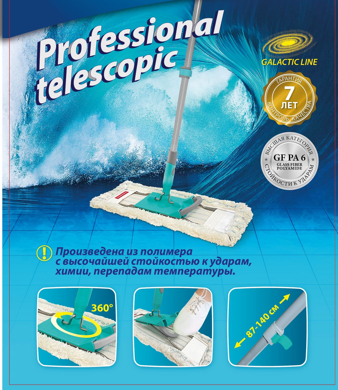 Швабра PROFESSIONAL HOME предназначена для влажной уборки пола и больших помещений. Ручка швабры включает противоскользящие, приятные на ощупь элементы из мягкого пластика. Швабра оснащена телескопическим механизмом, что позволяет выбрать комфортную длину для вашего роста.