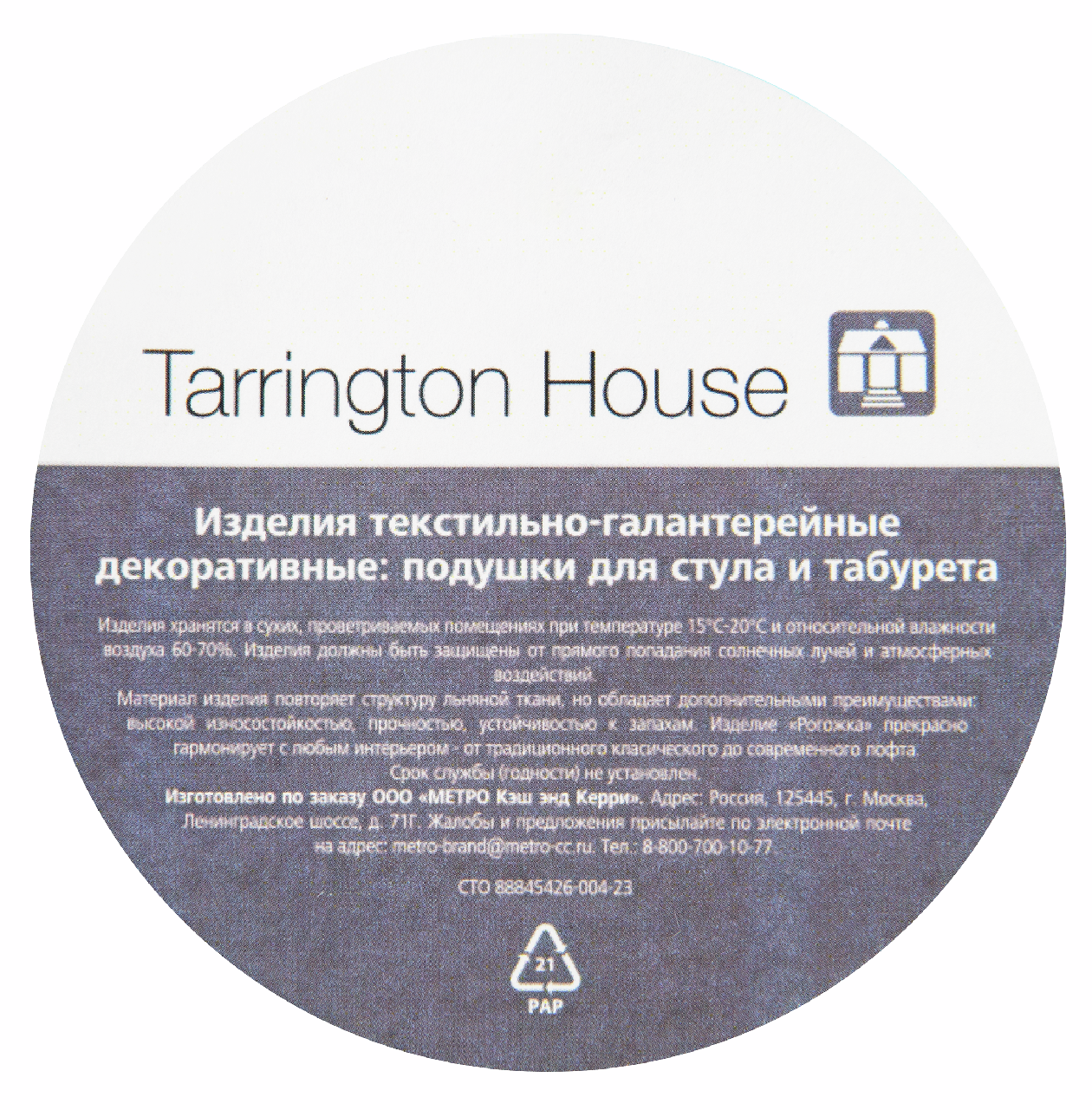 Tarrington House Сидушка рогожка кристалл, 40 x 40см из плотной ткани с переплетением рогожка, имитирующей фактуру натурального льна. Удобная и функциональная: легко крепится и надежно фиксируется завязками, прочная строчка по краю и наполнитель из пенополиуретана позволяют сохранять форму долгие годы. Ткань из 100% полиэстера прочная и износостойкая, легко стирается и быстро сохнет. Практичная – минимально подвержена загрязнениям, не впитывает запахи не задерживает пыль. Универсальные цвета и оттенки отвечают современным веяниям моды. Подушка будет гармонично смотреться в любом интерьере: подойдет для дома, дачи, кафе, летних веранд. С такой подушкой за столом будет комфортнее, а атмосфера – уютнее и теплее. Рекомендуем дополнить интерьер другими предметами из коллекции: скатертями и декоративными подушками в одной цветовой гамме или в разных, гармоничных цветах.