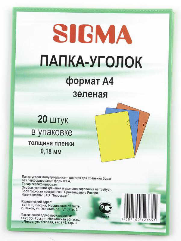 Папка-уголок SIGMA А4, 0.18 мм изготовлена из глянцевого полипропилена, плотность которой 0,18 мм. Надежно защищает бумаги от смятия, влаги и загрязнений. В папке удобно хранить и переносить документы, не беспокоясь об их сохранности и целости. Вмещает до 55 листов стандартного формата А4 обычной плотности, состоит из одного отделения. В упаковке находится 20 уголков различных цветов: синего, зеленого, красного, желтого.
