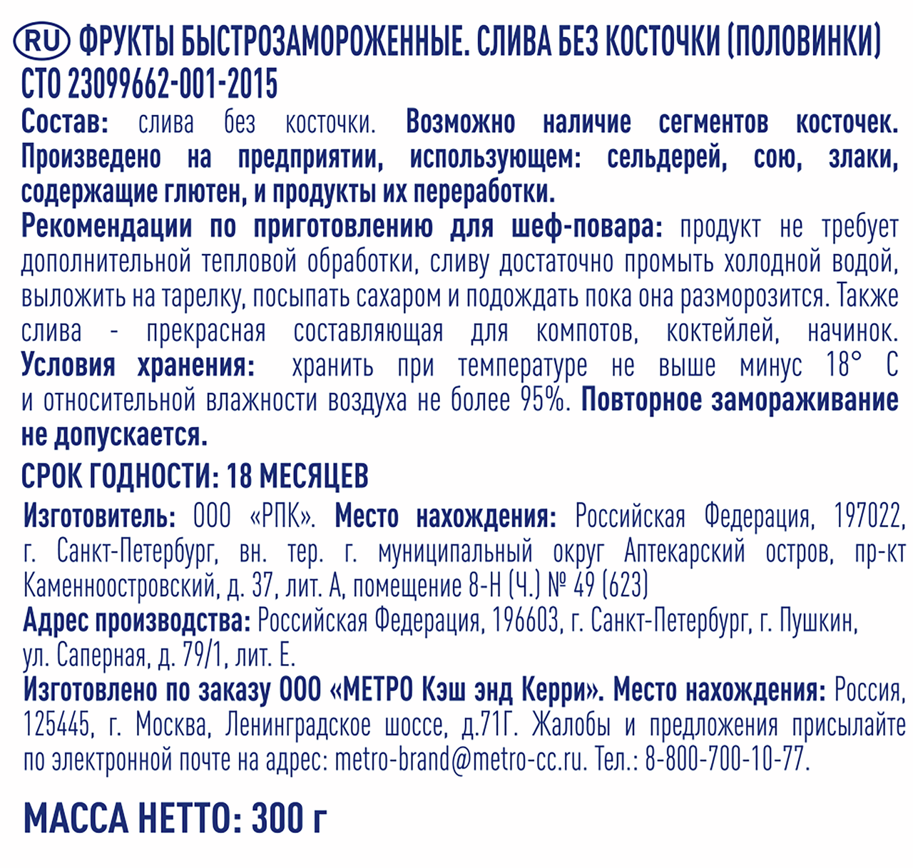 METRO Chef Слива половинки без косточек замороженная, 300г