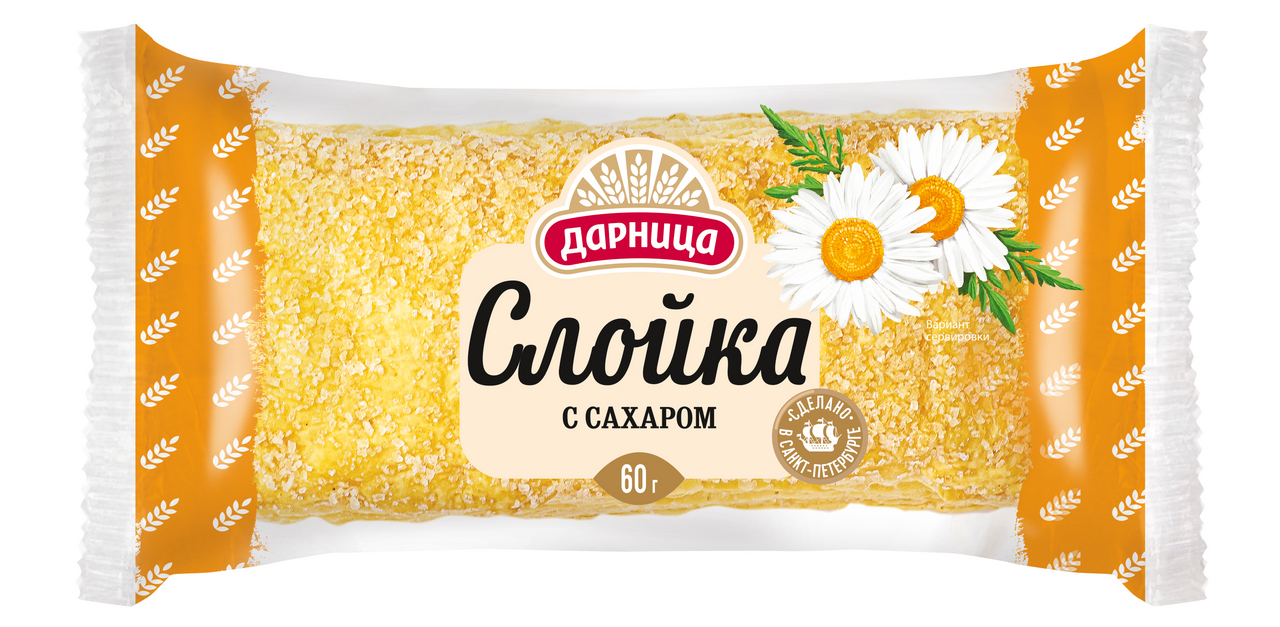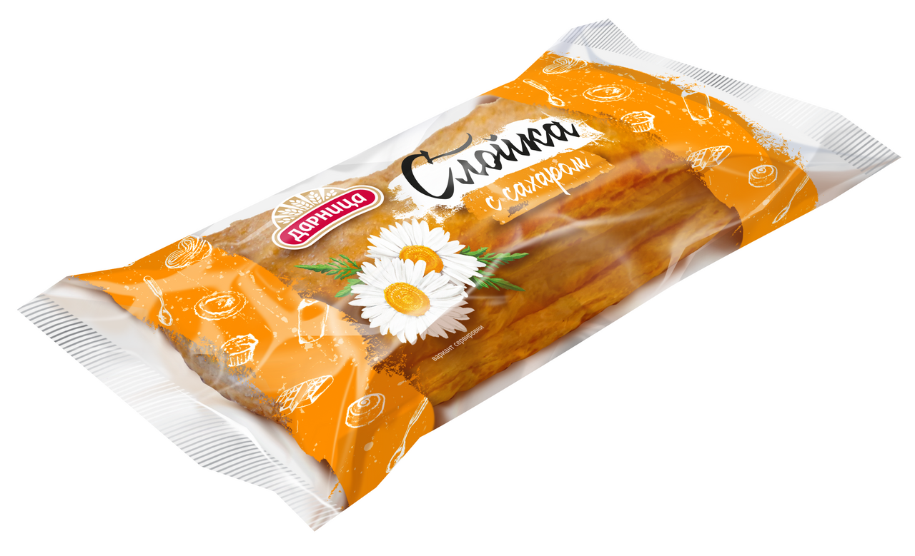 Хлебобулочное слоеное изделие, изготовленное из бездрожжевого теста из муки пшеничной хлебопекарной высшего сорта. Поверхность изделия отделана сахаром. Традиционная выпечка из слоеного теста. Она отлично подходит для семейного чаепития или вкусного перекуса в течение дня. В удобной упаковке хрустящая слоеная булочка, посыпанная сахаром.
