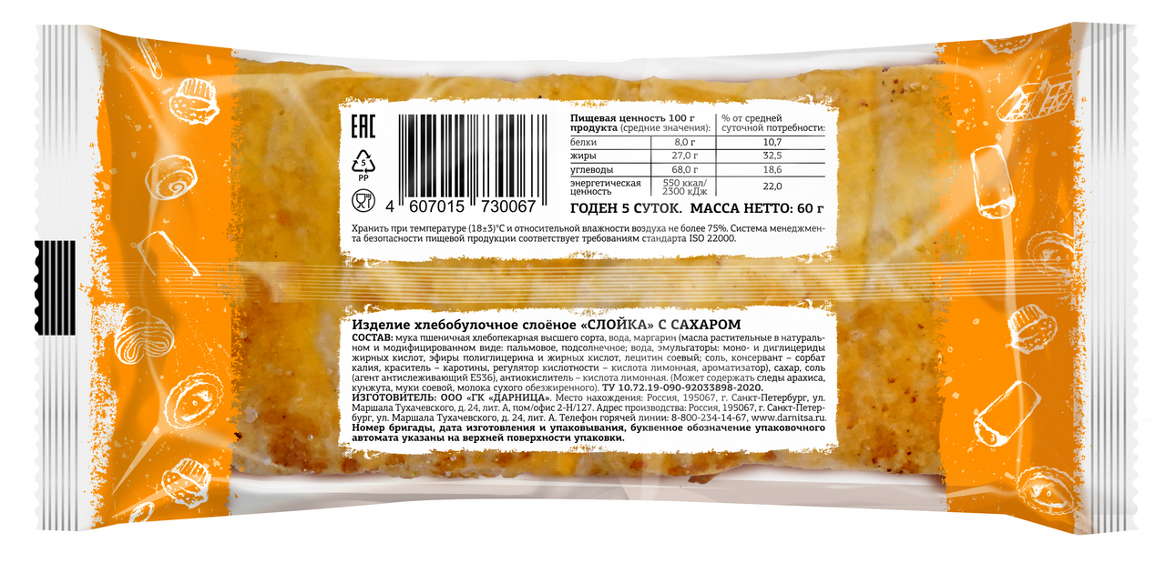 Мука пшеничная хлебопекарная высшего сорта, вода, маргарин (масла растительные в натуральном и модифицированном виде: пальмовое, подсолнечное, вода, эмульгаторы: моно- и диглицериды жирных кислот, эфиры полиглицерина и жирных кислот, лецитин соевый, соль, консервант - сорбат калия, краситель - каротины, регулятор кислотности - кислота лимонная, ароматизатор), сахар, соль (агент антислеживающий Е536), антиокислитель - кислота лимонная.