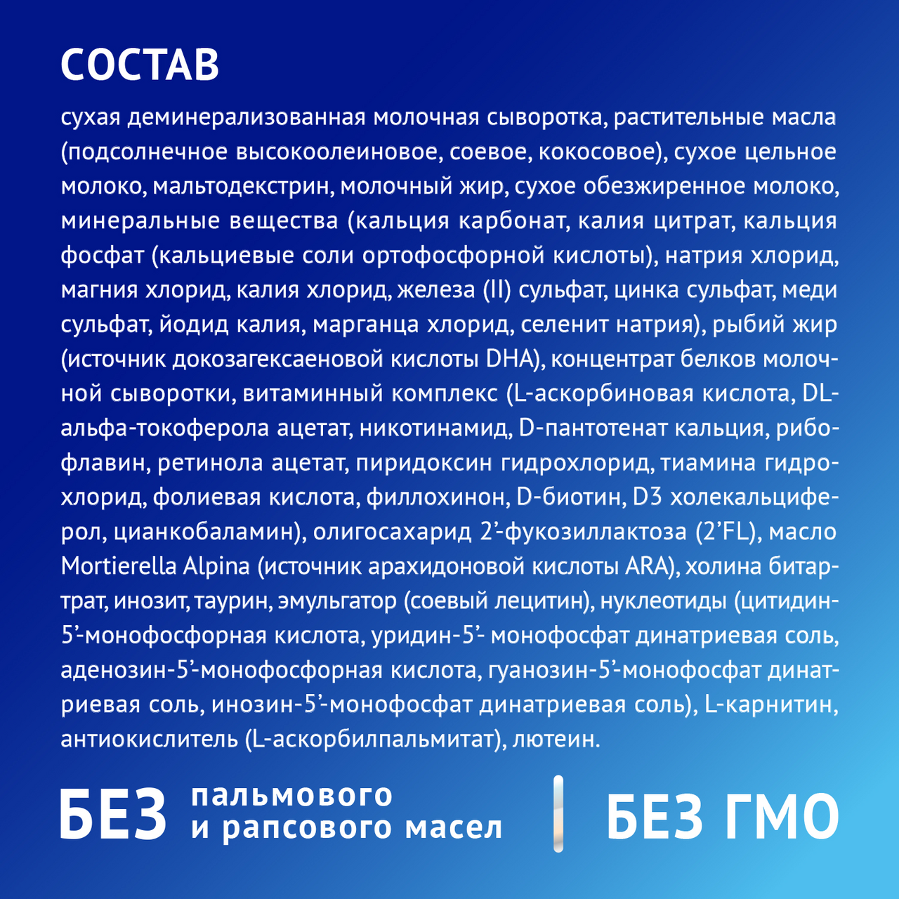 Сухая деминерализованная молочная сыворотка, растительные масла подсолнечное высокоолеиновое, соевое, кокосовое, сухое цельное молоко, мальтодекстрин, молочный жир, сухое обезжиренное молоко, минеральные вещества кальция карбонат, калия цитрат, кальция фосфат кальциевые соли ортофосфорной кислоты, натрия хлорид, магния хлорид, калия хлорид, железа сульфат, цинка сульфат, меди сульфат, йодид калия, марганца хлорид, селенит натрия, рыбий жир источник докозагексаеновой кислоты DHA, концентрат белков молочной сыворотки, витаминный комплекс L-аскорбиновая кислота, DL-альфа-токоферола ацетат, никотинамид, D-пантотенат кальция, рибофлавин, ретинола ацетат, пиридоксин гидрохлорид, тиамина гидрохлорид, фолиевая кислота, филлохинон, D-биотин, D3 холекальциферол, цианокобаламин, олигосахарид 2-фукозиллактоза 2FL, масло Mortierella Alpina источник арахидоновой кислоты ARA, холина битартрат, инозит, таурин, эмульгатор соевый лецитин, нуклеотиды цитидин-5-монофосфорная кислота, уридин-5-монофосфат динатриевая соль, аденозин-5-монофосфорная кислота, гуанозин-5-монофосфат динатриевая соль, инозин-5-монофосфат динатриевая соль, L-карнитин, антиокислитель L- аскорбилпальмитат, лютеин.