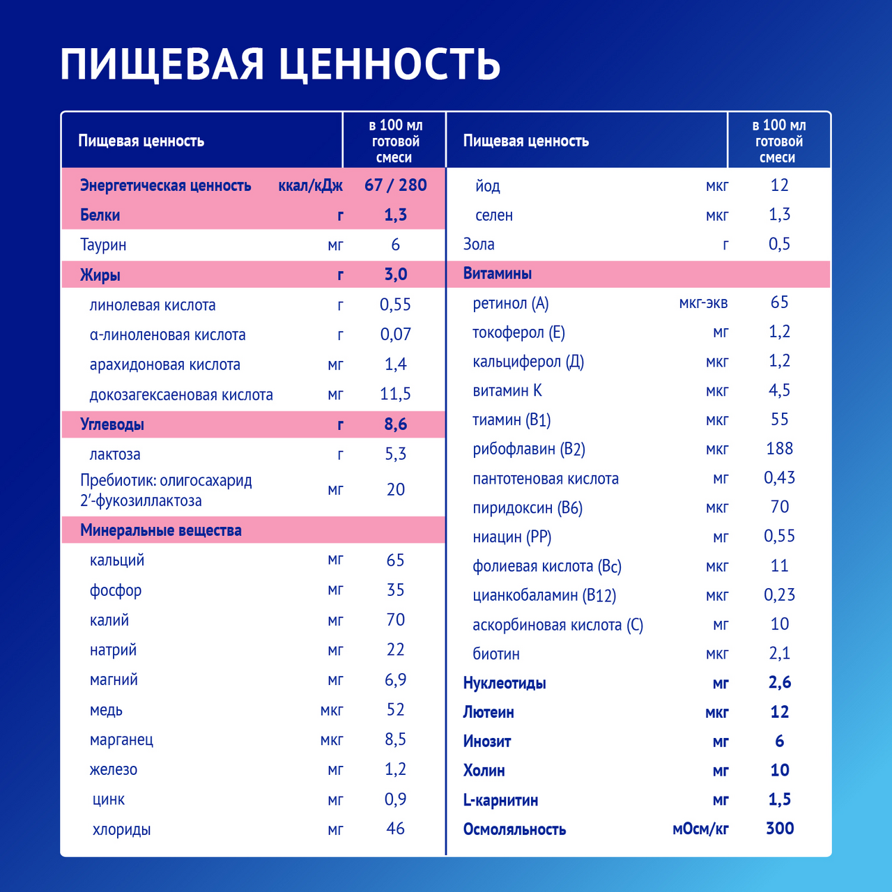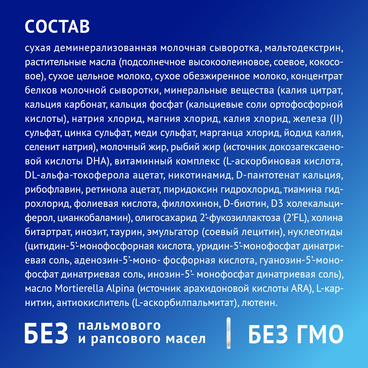 Сухая деминерализованная молочная сыворотка, мальтодекстрин, растительные масла подсолнечное высокоолеиновое, соевое, кокосовое, сухое цельное молоко, сухое обезжиренное молоко, концентрат белков молочной сыворотки, минеральные вещества калия цитрат, кальция карбонат, кальция фосфат, натрия хлорид, магния хлорид, калия хлорид, железа сульфат, цинка сульфат, меди сульфат, марганца хлорид, йодид калия, селенит натрия, молочный жир, рыбий жир источник докозагексаеновой кислоты DHA, витаминный комплекс L-аскорбиновая кислота, DL-альфа-токоферола ацетат, никотинамид, D-пантотенат кальция, рибофлавин, ретинола ацетат, пиридоксин гидрохлорид, тиамина гидрохлорид, фолиевая кислота, филлохинон, D-биотин, D3 холекальциферол, цианокобаламин, олигосахарид 2-фукозиллактоза, холина битартрат, инозит, таурин, эмульгатор соевый лецитин, нуклеотиды цитидин-5-монофосфорная кислота, уридин-5- монофосфат динатриевая соль, аденозин-5-монофосфорная кислота, гуанозин-5-монофосфат динатриевая соль, инозин-5-монофосфат динатриевая соль, масло Mortierella Alpina источник арахидоновой кислоты ARA, L-карнитин, антиокислитель аскорбилпальмитат, лютеин.