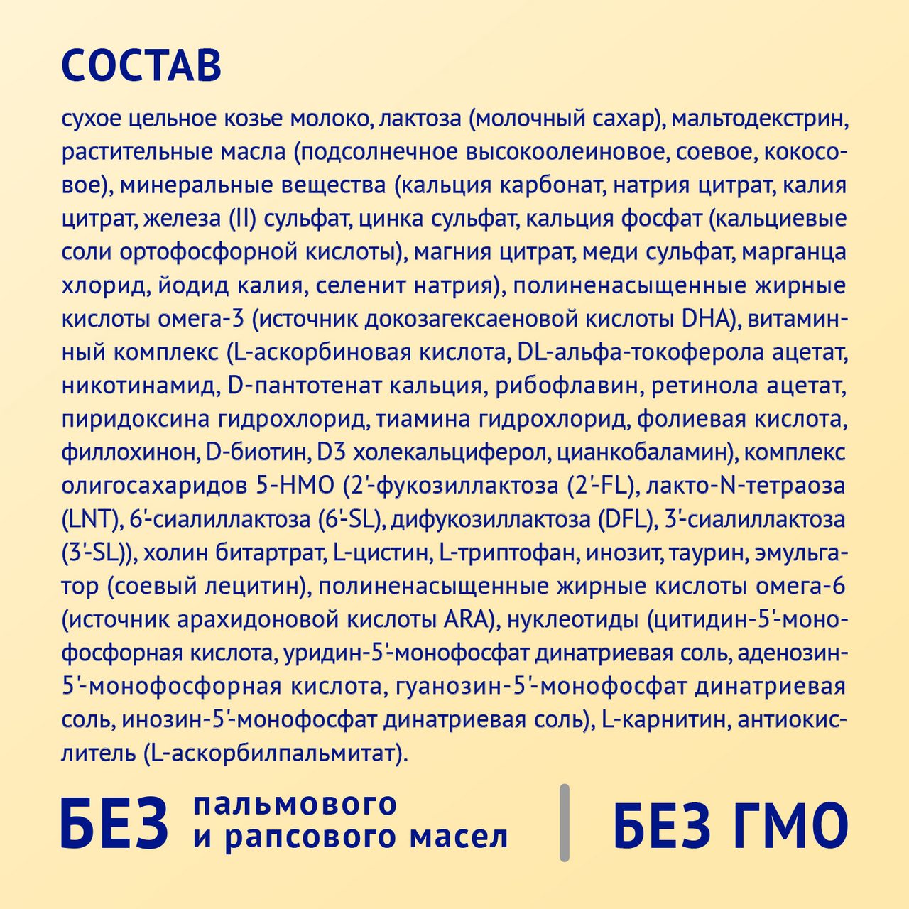 Сухое цельное козье молоко, лактоза молочный сахар, мальтодекстрин, растительные масла подсолнечное высокоолеиновое, соевое, кокосовое, минеральные вещества кальция карбонат, натрия цитрат, калия цитрат, железа сульфат, цинка сульфат, кальция фосфат кальциевые соли ортофосфорной кислоты, магния цитрат, меди сульфат, марганца хлорид, йодид калия, селенит натрия, полиненасыщенные жирные кислоты омега-3 источник докозагексаеновой кислоты DHA, витаминный комплекс L-аскорбиновая кислота, DL-альфа-токоферола ацетат, никотинамид, D-пантотенат кальция, рибофлавин, ретинола ацетат, пиридоксина гидрохлорид, тиамина гидрохлорид, фолиевая кислота, филлохинон, D-биотин, D3 холекальциферол, цианкобаламин, комплекс олигосахаридов 5-HMO 2-фукозиллактоза 2-FL, лакто-N-тетраоза LNT, 6-сиалиллактоза 6-SL, дифукозиллактоза DFL, 3-сиалиллактоза 3-SL, холин битартрат, L-цистин, L-триптофан, инозит, таурин, эмульгатор соевый лецитин, полиненасыщенные жирные кислоты омега-6 источник арахидоновой кислоты ARA, нуклеотиды цитидин-5-монофосфорная кислота, уридин-5-монофосфат динатриевая соль, аденозин-5-монофосфорная кислота, гуанозин-5-монофосфат динатриевая соль, инозин-5-монофосфат динатриевая соль, L-карнитин, антиокислитель L-аскорбилпальмитат.