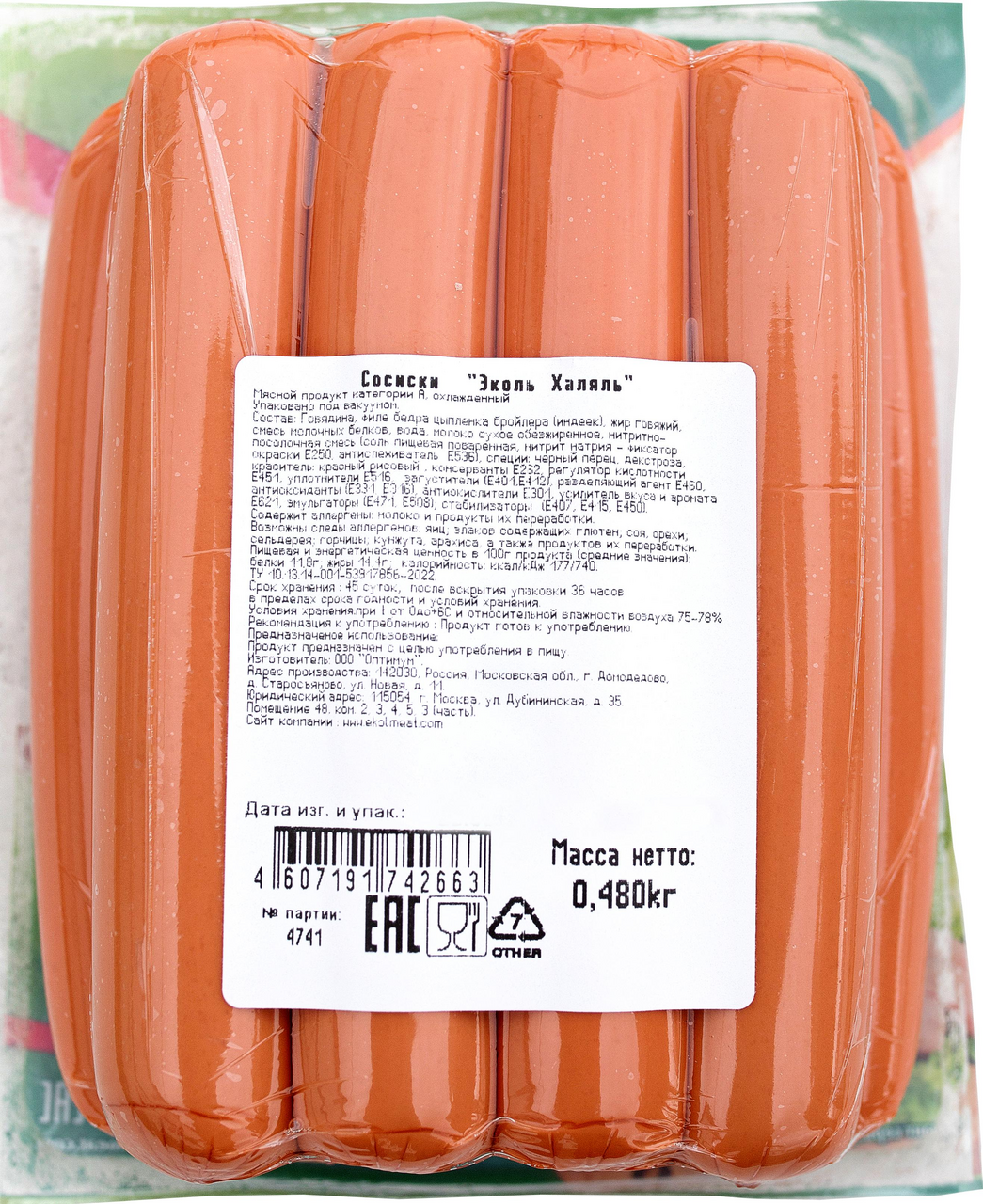 Сосиски Эколь Халяль Молочные, 480г - это охлажденный мясной полуфабрикат категории А, приготовленный из отборной говядины и диетического филе куриных грудок. Для производства этих сосисок используется сырье, строго соответствующее всем правилам Халяль. Ни на одном этапе говядина и курица не подвергаются заморозке, а дальнейшая переработка и разделка мяса происходят при температуре от 0 до +4С. Вакуумная упаковка позволяет сохранить свежесть продукта, а также его органолептические свойства в течение всего срока годности.