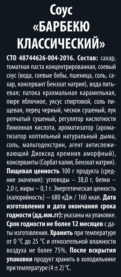 Сахар, томатная паста концентрированная, соевый соус (вода, соевые бобы, пшеница, соль, сахар, консервант бензоат натрия), вода питьевая, патока крахмальная карамельная, пюре яблочное, уксус спиртовой, соль пищевая, перец черный, чеснок сушеный, лук репчатый сушеный, регулятор кислотности лимонная кислота, ароматизатор (ароматизатор коптильный натуральный дыма, соль, мальтодекстрин, агент антислеживающий диоксид кремния аморфный), консерванты (сорбат калия, бензоат натрия).
