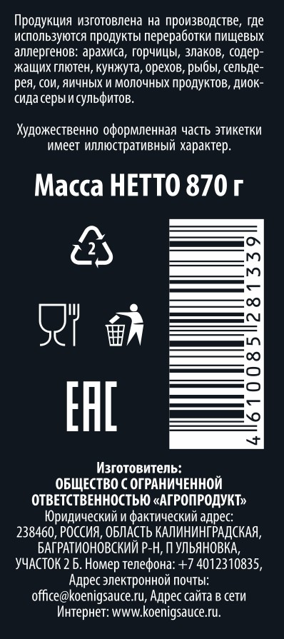 Вода питьевая, масло подсолнечное рафинированное дезодорированное, начинка овощная (вода питьевая, овощи сушеные (чеснок, лук, петрушка), сахар, соль пищевая, стабилизаторы (дикрахмалфосфат оксипропилированный, ксантановая камедь), регулятор кислотности (уксусная кислота ледяная), ароматизаторы натуральные (олеорезины: чеснока, красного перца), консерванты (сорбат калия, бензоат натрия)), сахар, загуститель дикрахмалфосфат ацетилированный, желток яичный сухой ферментированный, стабилизаторы (гуаровая камедь, ксантановая камедь), соль пищевая, уксус спиртовой, регуляторы кислотности (молочная кислота, l-, d- и dl-, уксусная кислота ледяная), ароматизаторы пищевые (вкусоароматические вещества, носители (триацетин, пропиленгликоль), масло рапсовое рафинированное, дезодорированное), консерванты (сорбат калия, бензоат натрия), глюкоза ферментированная, мальтодекстрин, консервант (пиросульфит калия), л-лизин гидрохлорид, антиокислитель этилендиаминтетраацетат кальция-натрия.