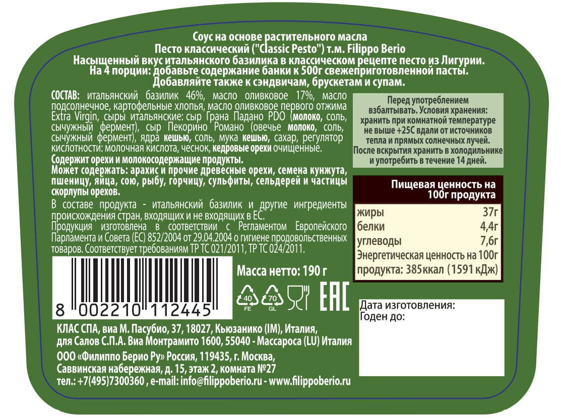 Итальянский базилик 46%, масло оливковое 17%, масло подсолнечное, картофельные хлопья, масло оливковое первого отжима Extra Virgin, сыры итальянские: сыр Грана Падано (молоко коровье, соль, сычужный фермент), сыр Пекорино Романо (молоко овечье, соль, сычужный фермент), ядра кешью, соль поваренная пищевая, мука кешью, сахар, орехи кедровые очищенные, чеснок, регулятор кислотности: Е575.