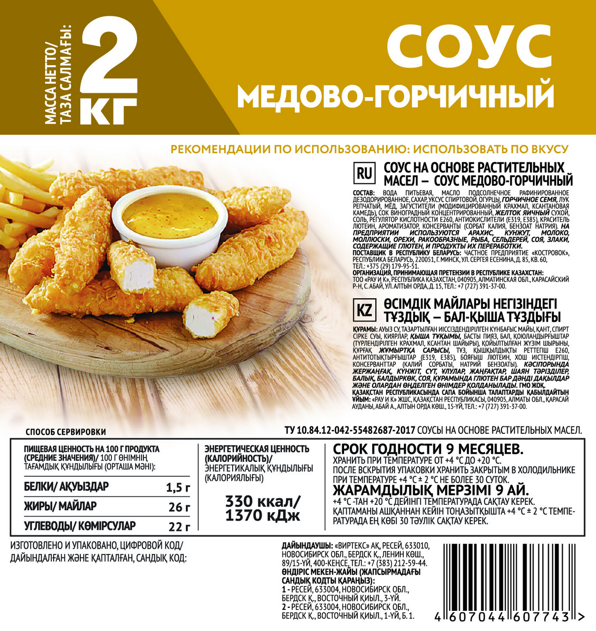 Вода питьевая, масло подсолнечное рафинированное дезодорированное, сахар, уксус спиртовой, огурцы, горчичное семя, лук репчатый, мёд, загустители (модифицированный крахмал, ксантановая камедь), сок виноградный концентрированный, желток яичный сухой, соль, регулятор кислотности Е260, антиокислители Е319, Е385, краситель лютеин, ароматизатор, консерванты (сорбат калия, бензоат натрия).