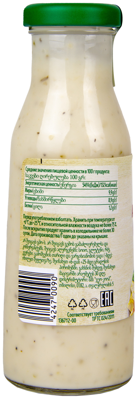 Вода, рапсовое масло рафинированное, спиртовой уксус, глюкозно-фруктозный сироп (глюкоза, фруктоза), пахта, лук, модифицированный кукурузный крахмал, тертый твердый сыр (молоко, соль, сухая молочная сыворотка, сычужный фермент), чеснок, соль, орегано, загуститель: ксантановая камедь; соевый соус (вода, соя, пшеница (содержит глютен), соль), регулятор кислотности: молочная кислота, молочный белок, концентрированный лимонный сок, натуральные ароматизаторы: пармезан, чеснок, сливочный крем, перец черный.