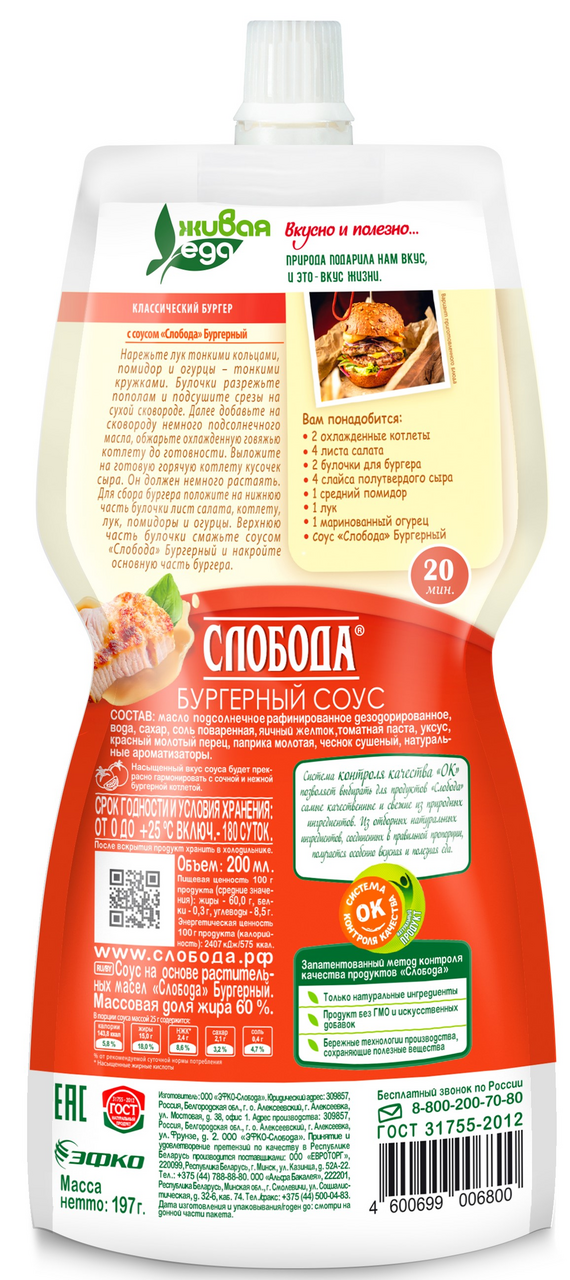 Бургерный соус — это гармоничное сочетание пикантных специй, томатов, майонезной основы и лёгкой сладко-горчичной нотки. Он подчёркивает вкус мяса, добавляет сочности и делает каждый укус насыщенным и сбалансированным. Идеален не только для бургеров, но и для сэндвичей, наггетсов, картофеля фри и гриль-блюд. Универсальный, густой и ароматный — он станет незаменимым соусом в вашей кухне.