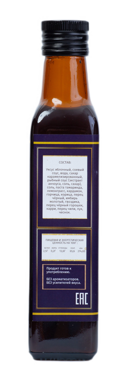 Уксус яблочный, соевый соус, вода, сахар карамелизированный, рыбный соус экстракт анчоуса, соль, сахар, паста тамаринда, лемонграсс, кардамон, горчица, корица, перец черный, имбирь молотый, гвоздика, перец черный горошек, карри, перец чили, лук, чеснок.