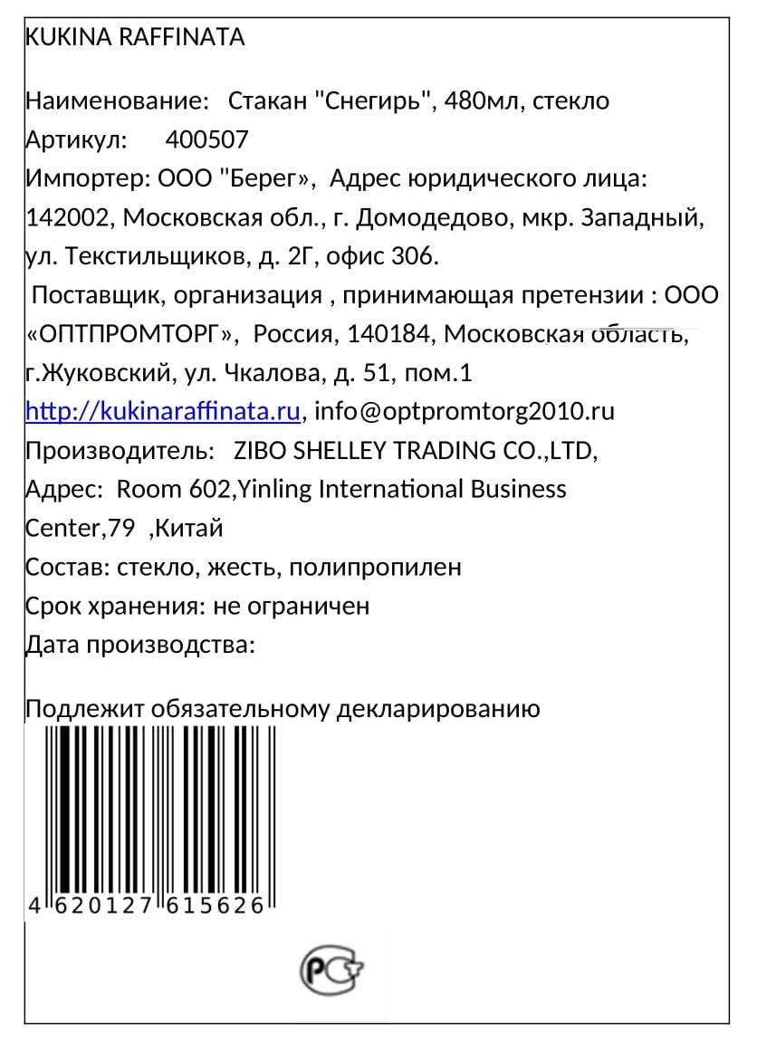 Стакан Kukina Raffinata Снегирь стекло, 480мл
