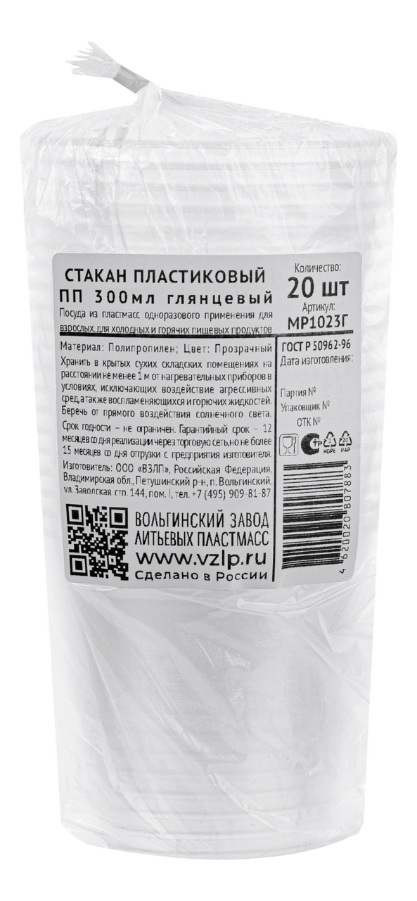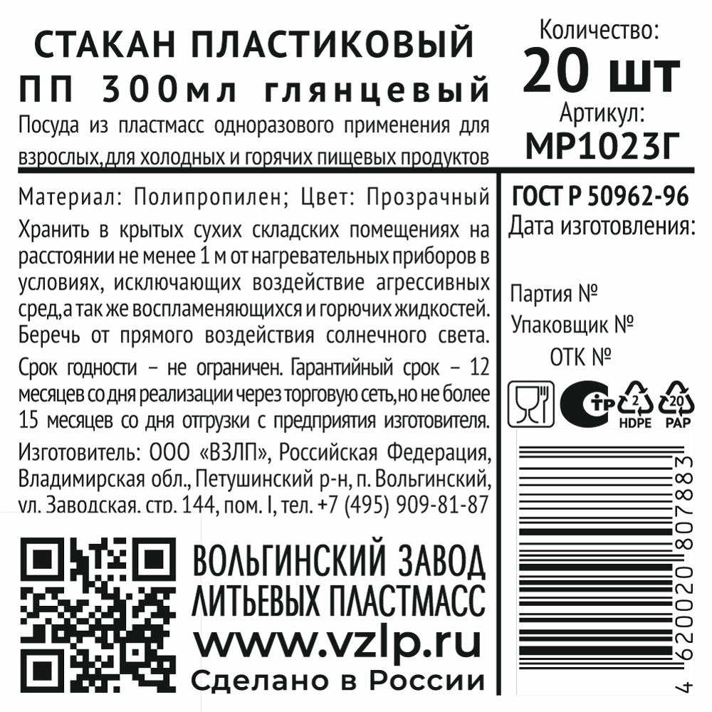 Стакан одноразовый Vzlp глянцевый пластиковый прозрачный 300мл, 20шт