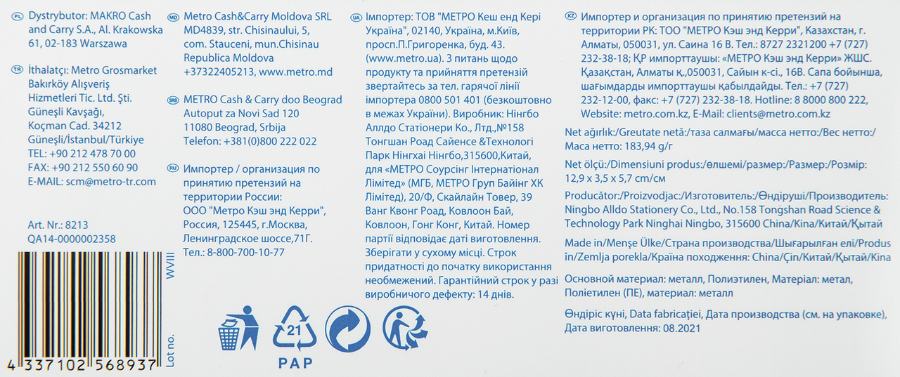 Настольный степлер с пробивной мощностью 20 листов. aro — это собственная торговая марка компании Metro Cash & Carry. В ассортименте — несколько тысяч продовольственных и непродовольственных товаров первой необходимости.