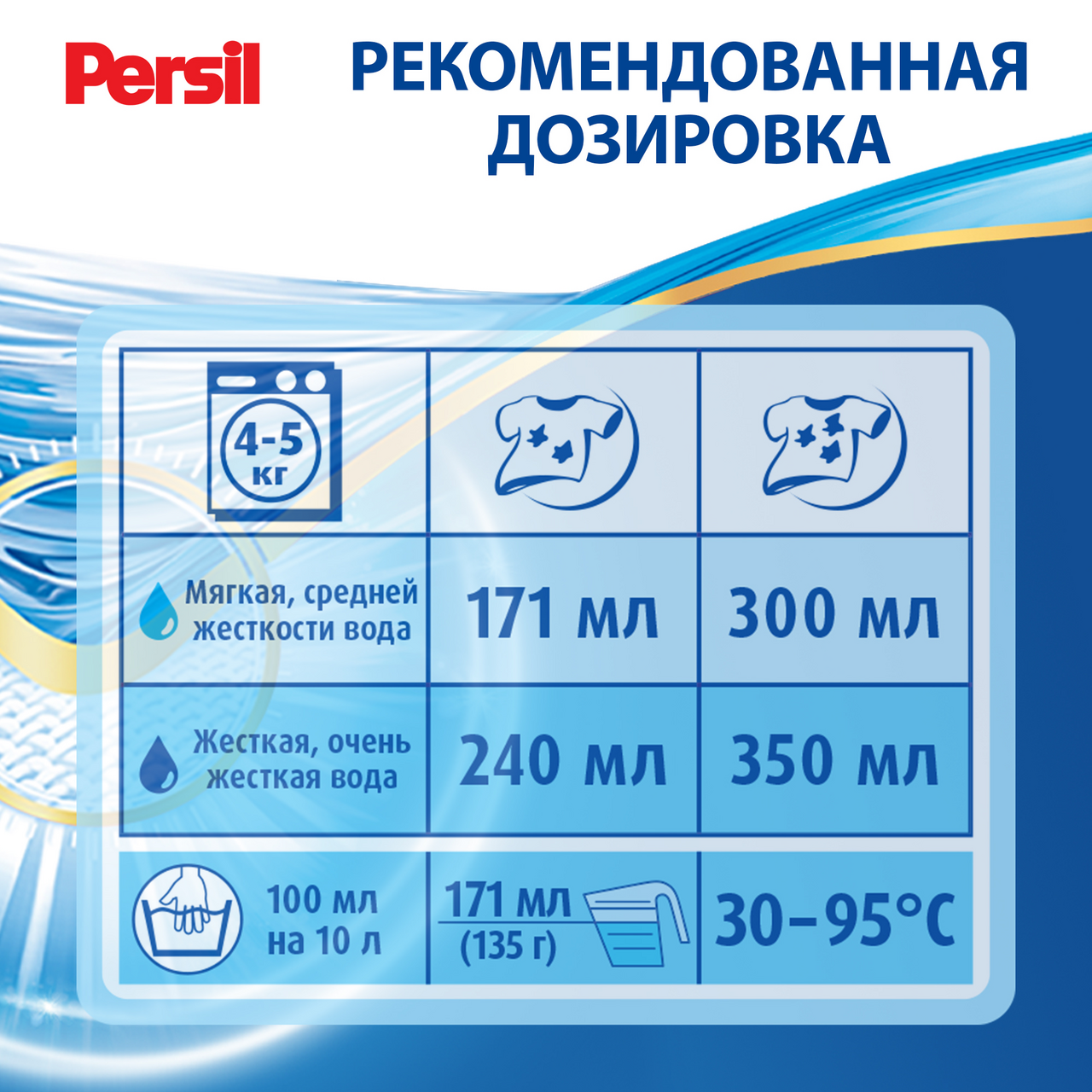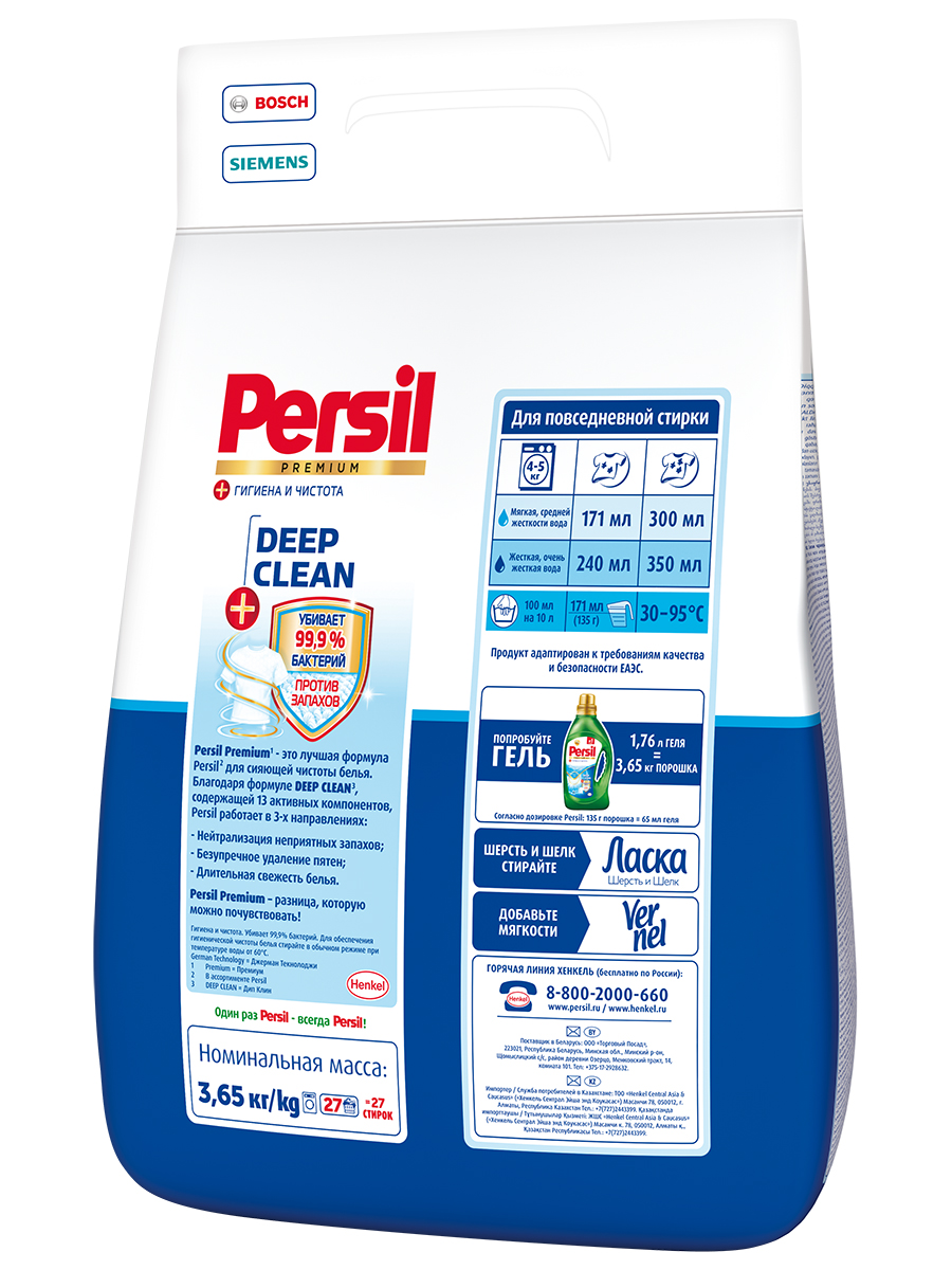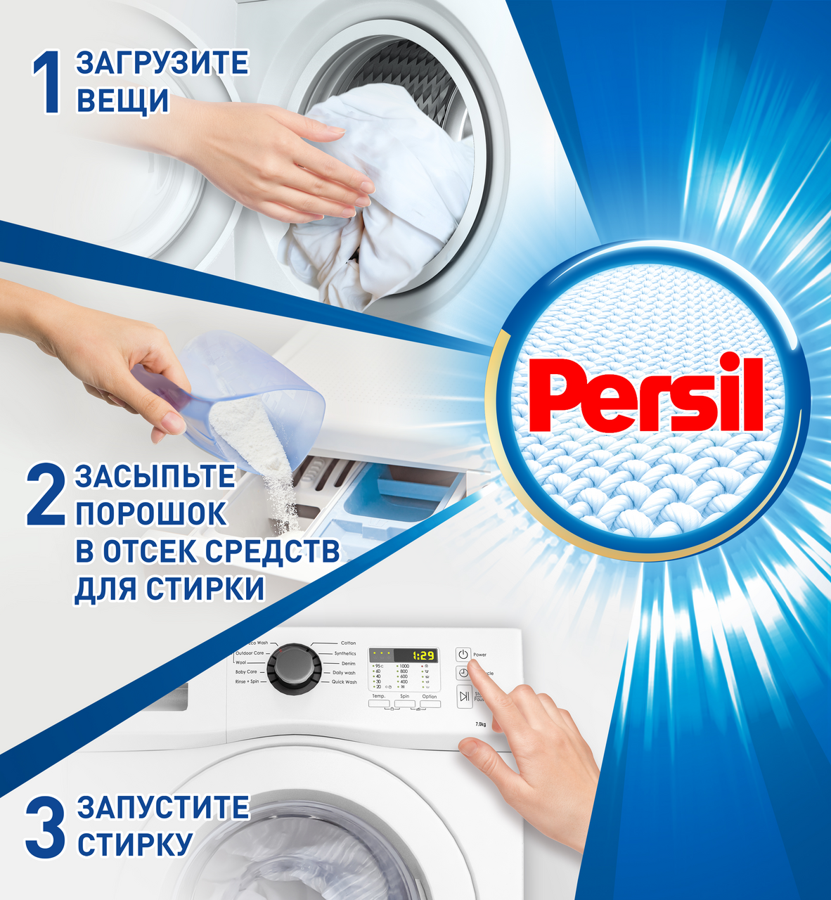 Стиральный порошок Персил Premium разработан для белых вещей, обеспечивает безупречное удаление пятен и возвращение сияющей белизны. Аромат средства Персил Премиум подарит длительную свежесть белью до 4-х недель при хранении. Порошок для стирки белого белья Персил подходит для стирки белых изделий из хлопчатобумажных, льняных, синтетических тканей и тканей из смешанных волокон в стиральных машинах-автоматах и ручной стирки.