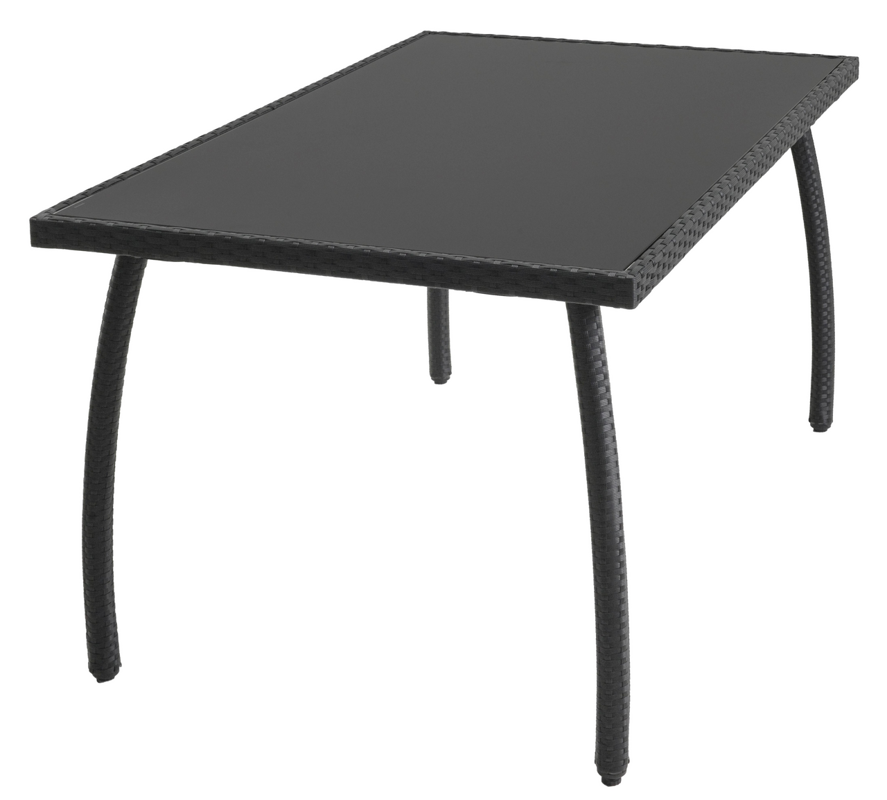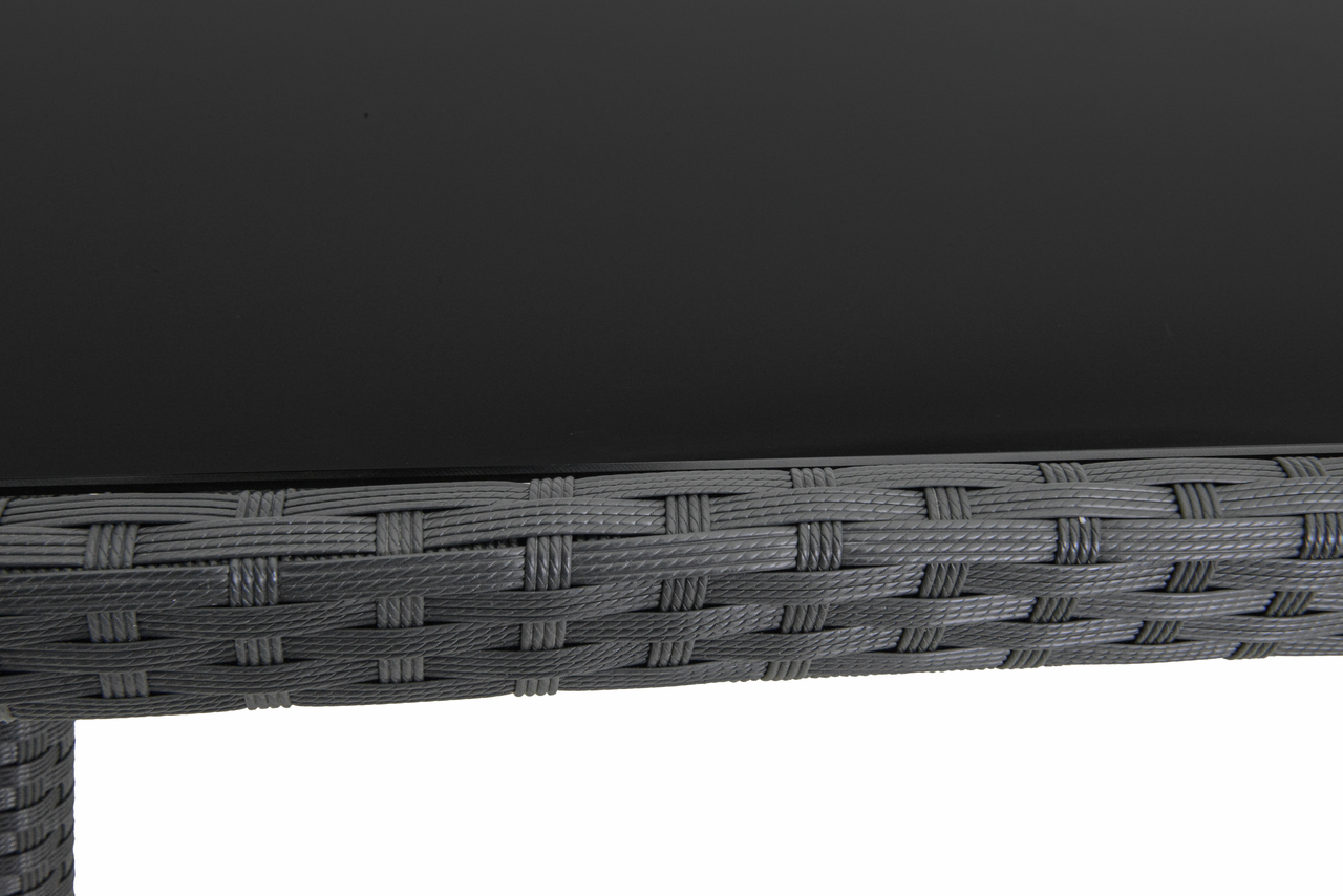 Tarrington House Стол прямоугольный искусственный ротанг сталь стекло черный, 150 x 90 см представляет собой садовую мебель, которую можно разместить на приусадебных участках. Его можно установить в беседке или в зоне отдыха в санаториях и пансионатах, использовать на летних площадках в заведениях общественного питания. Стол можно устанавливать в помещениях и на открытом воз��ухе. Он не подвержен влиянию солнечных лучей, не боится перепада температур и воздействия других внешних факторов. Каркас стола изготовлен из прочного материала – алюминия. Сверху имеется покрытие из искусственного ротанга, имитирующее плетение. Стол имеет прямоугольную форму. На столешнице можно свободно разместить достаточное количество блюд для небольшой компании. Поверхность стола легко очищается от пыли и других загрязнений с помощью влажной губки.