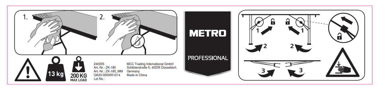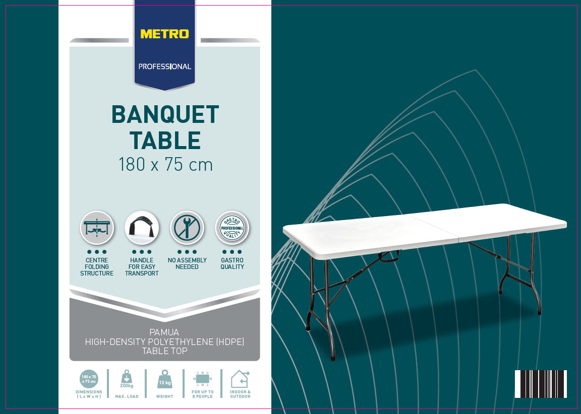 METRO PROFESSIONAL Стол складной, 180см - стальная рама с порошковым покрытием. Максимальная нагрузка: 200кг. Изделие выполнено из качественного пластика с каркасом из стали и складывается в одно движение. В собранном состоянии не занимает много места, поэтому его удобно как хранить, так и транспортировать.