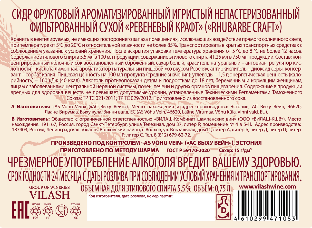 Яблочный сок сброженный, ревеневый сок, регулятор кислотности лимонная кислота, диоксид серы, сорбат калия.