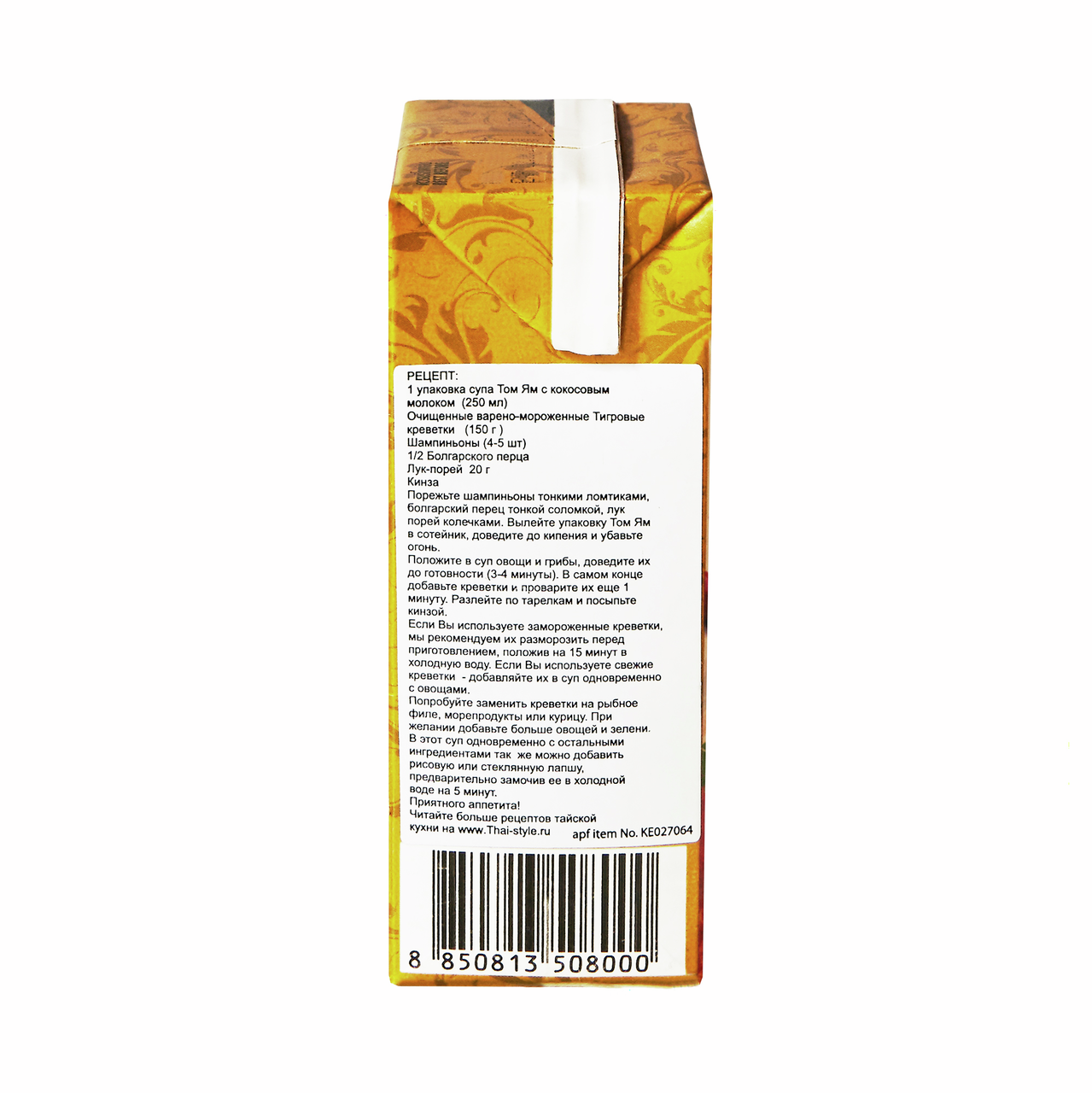 Традиционный тайский суп на основе кокосового молока, тайских трав и специй. Этот суп-основа содержит только натуральные ингредиенты без добавления консервантов и ароматизаторов. Добавив в суп небольшое количество ингредиентов (например: креветки, грибы или любые морепродукты), вы получите настоящий Том Ям, приготовленный по традиционному тайскому рецепту. Уникальное сочетание немного острого и кислого вкуса делает этот суп идеальным началом трапезы.Умеренно острый. Не требует разведения водой. Способ приготовления: перед открытием хорошо встряхнуть. Вылить содержимое пакета в кастрюлю, добавить креветки, грибы - около 250-300г любых ингредиентов по вкусу. Варить, помешивая, на среднем огне до готовности ингредиентов (3-5 мин). Вместо креветок можно добавлять курицу, морепродукты и/или овощи. Перед подачей посыпать кинзой. Для смягчения вкуса можно добавить немного кокосового молока. 1 пакета супа Том Ям достаточно для приготовления 1-2 порций. Продукт приготовлен и упакован с помощью метода ультрапастеризации и не содержит консервантов. Традиционный тайский суп на натуральном кокосовом молоке с травами. Готовый суп-основа, приготовленный только из натуральных ингредиентов без добавления консервантов и ароматизаторов, имеющий ярко выраженный вкус и аромат тайских трав и специй. Низкокалорийный продукт подходит для диетического питания. Не острый. Не требующий разведения водой.
