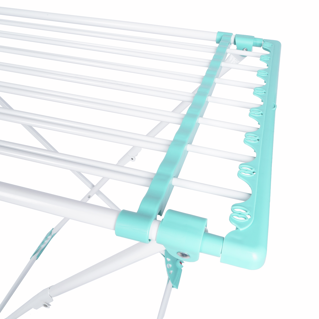 Напольная сушилка для белья Aura Deluxe X это практичное решение для сушки белья дома. Конструктивная особенность сушилки позволяет установить подходящую длину прутьев с помощью телескопического сдвижения. Колесные опоры обеспечивают легкое передвижение сушилки по дому. Диаметр металлических прутьев позволяет сушить белье без заломов. Качественное порошковое окрашивание металлических элементов конструкции защищает от образования ржавчины. Полезная длина для навески белья 20 метров.