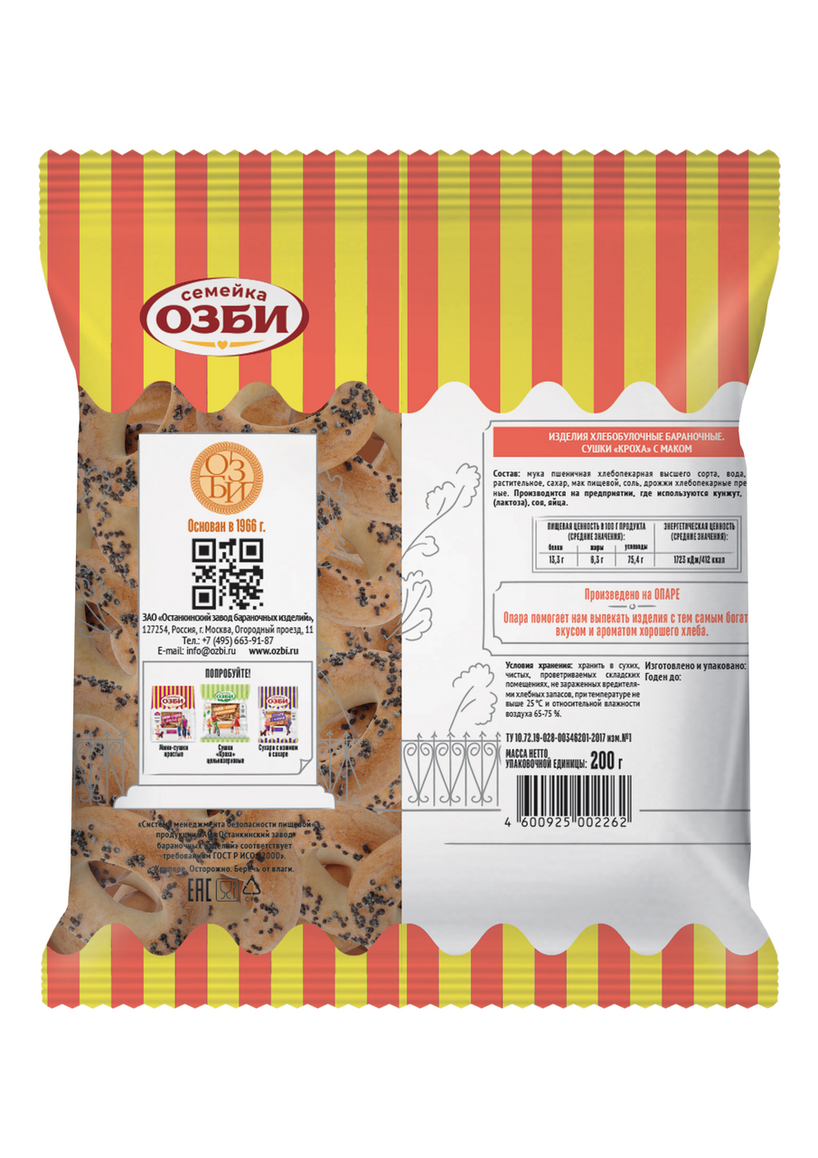 Сушки относятся к группе изделий хлебобулочных бараночных. В древней Руси сушки часто заготавливали на зиму, брали с собой в походы, ими украшали дом, без боязни, что они могут испортиться или пересушиться. Сушки "Семейка ОЗБИ" (в том числе и мини сушки) вырабатываются классическим способом тестоприготовления с использованием опары и соблюдением всех необходимых технологических характеристик и параметров. В результате чего готовая продукция имеет более развитую пористость, хрупкость, необходимую кислотность, вкус и запах свойственные данному виду продукта.