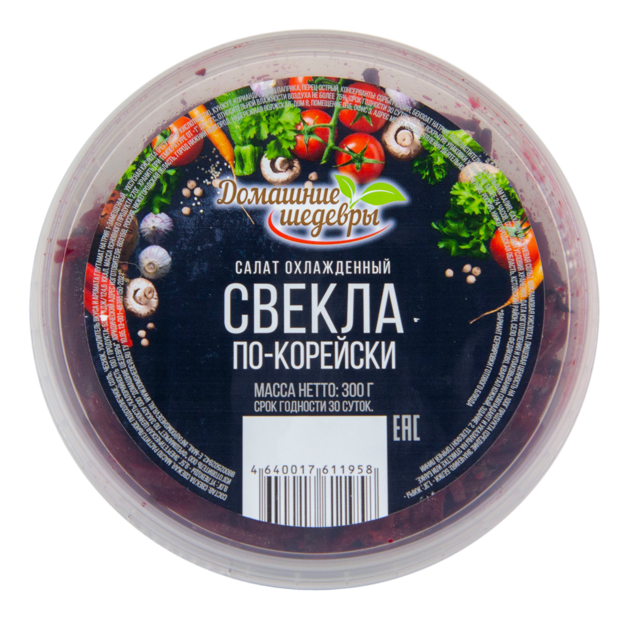Свекла столовая, масло подсолнечное рафинированное дезодорированное, чеснок, сахар, соль, регулятор кислотности: уксусная кислота, кориандр молотый, перец красный молотый, усилитель вкуса и аромата глутамат натрия, консерванты: сорбат калия, бензоат натрия.