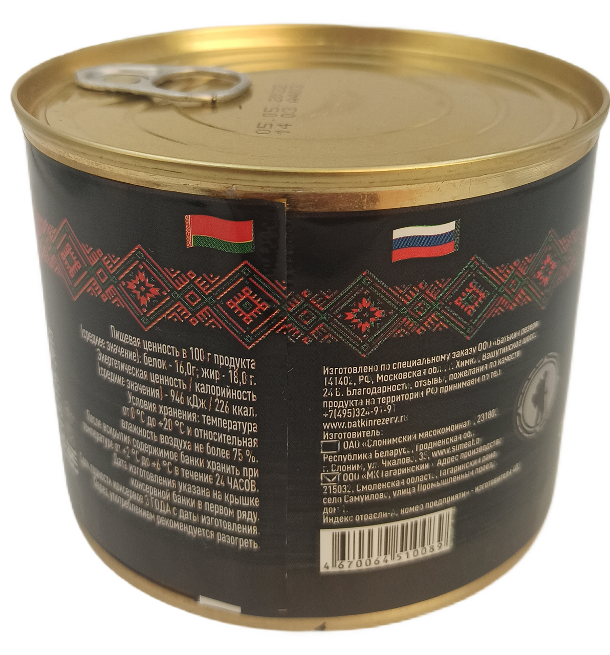 Свинина тушеная Батькин Резерв, 525г – вкусный и питательный продукт, способный быстро утолить голод и наполнить организм энергией, которой хватит на много часов. В основе лежит отборное мясо высшего сорта, сочетающее в себе превосходный вкус и яркий аромат. Оно имеет богатый витаминно-минеральный комплекс, который включает в себя витамины группы B, магний, натрий, кальций, железо и другие не менее важные для организма элементы. Кроме мяса, в составе есть лавровый лист, черный молотый перец, лук и пищевая поваренная соль. Тушеную свинину можно употреблять в качестве самостоятельного продукта или использовать для приготовления более сложных блюд. Например, из нее можно сделать и суп и жаркое. Самый простой и сытный вариант – это приготовить любой гарнир к тушенке, что особенно актуально во время поездок на природу. Под торговой маркой Батькин Резерв на российский рынок поставляется широкий выбор мясных консервов премиального качества. Телята, поросята и цыплята выращены на натуральных кормах без использования каких-либо искусственных добавок, антибиотиков или ГМО. Благодаря этому конечная продукция имеет такой вкус, как если бы ее приготовили в домашних условиях. В процессе производства компания не разбавляют продукцию жилами, кожей, костной мукой или растительными белками, что гарантирует высокое качество продукции.