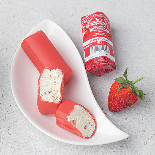 Натуральный творог с кусочками сушёной клубники в яркой клубничной глазури: этот сырок очень любят как дети, так и взрослые за его выраженный сладкий ягодный вкус. Клубничный сырок хорошо сочетается с крепким кофе или зелёным чаем. Придёт на помощь, когда хочется утолить тягу к сладкому с пользой.