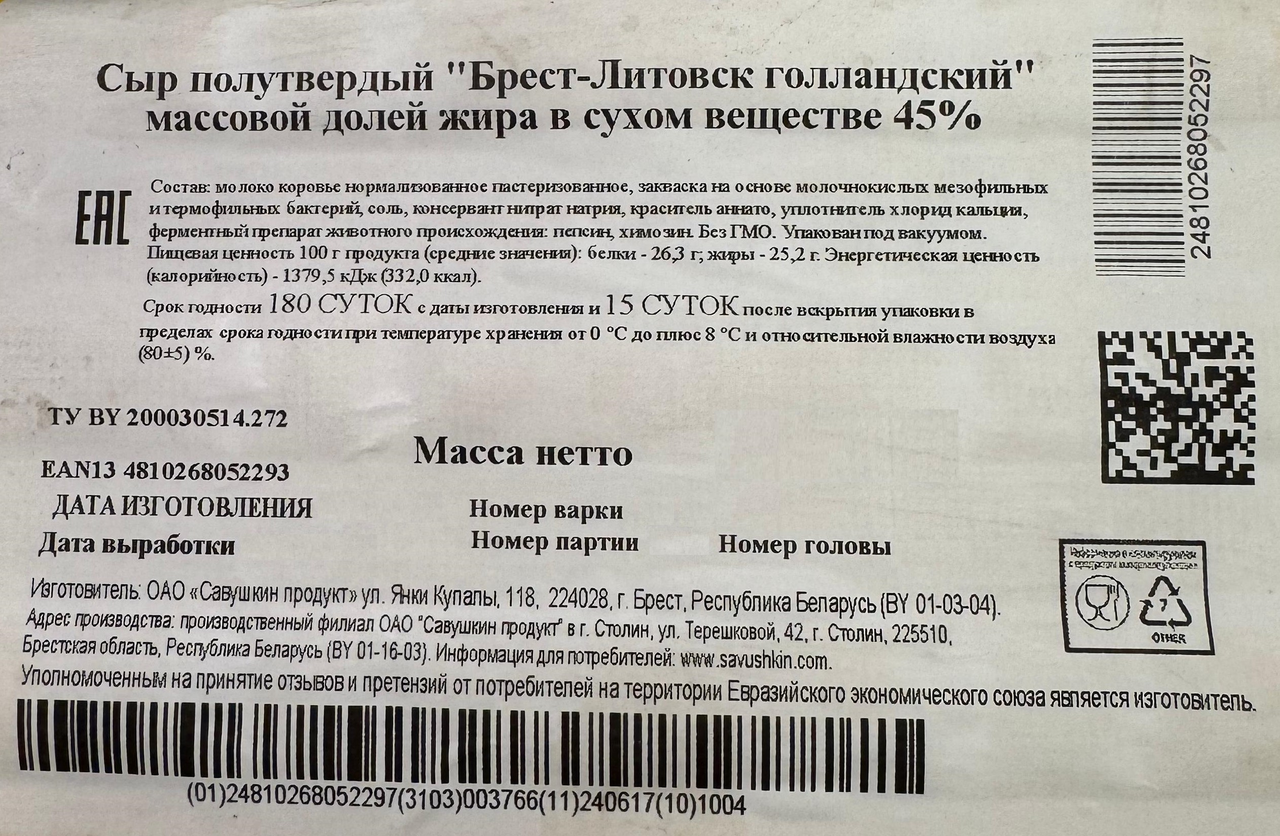 Сыр полутвердый Брест-Литовск Голландский, обладая пикантным вкусом, объединяет в себе легкий молочный вкус с тонкими нотками остроты и кислинки. Мастера-сыровары с гордостью следуют вековым традициям изготовления сыра. Без ГМО.