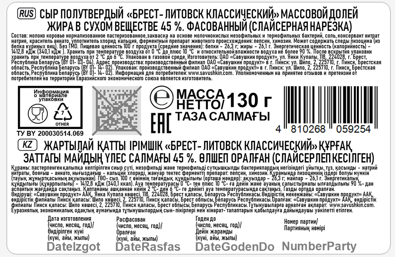 Сыры Брест-Литовск - это воплощение лучших европейских традиций сыроварения. Незыблемые традиции и старинная рецептура позволяют в полной мере ощутить вкус истории и почувствовать себя приобщенным к аристократическому сословию. Сыр Брест-Литовск классический обладает мягким сладко-сливочным вкусом и тонким сырным ароматом. Нежная консистенция и рисунок из мелких глазков неправильной угловатой формы, равномерно расположенный по сей сырной массе, придают сыру индивидуальность. Данный сыр универсален в кулинарии, поэтому его можно смело использовать в качестве закуски или в приготовлении кулинарных изысков. Слайсерная нарезка поможет в приготовлении идеальных бутербродов и сэндвичей.