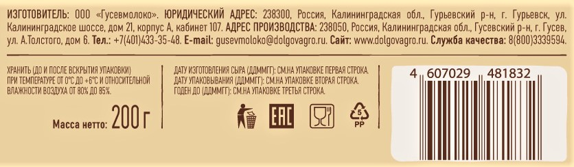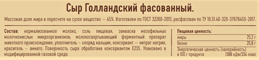 Сыр Нежинская Голландский кусок 45%, 200г