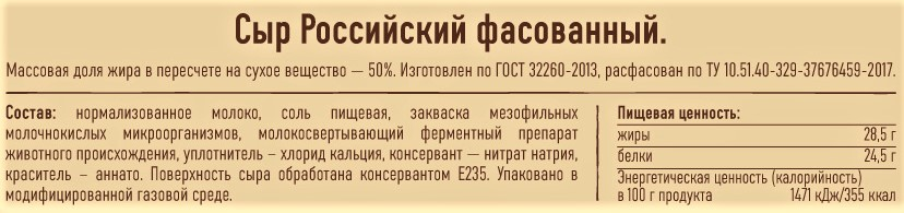 Это полутвердый российский сыр. Производится из пастеризованного нормализованного молока коровы. Продукт наполовину состоит из ценных жиров, полезных для организма. Светло-желтого цвета, в меру соленый. Выпускается цельным куском, который легко нарезается и натирается на терке, не размазываясь. Срез получается ровный, гладкий, без трещин и влаги. Хорошо сочетается с белым и черным хлебом, овощами, макаронами.