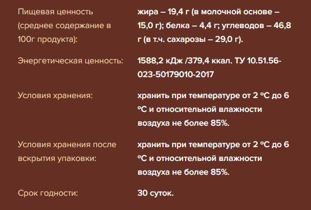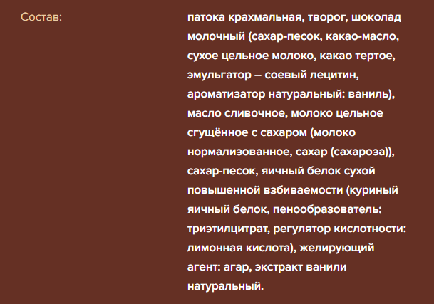 Патока крахмальная, творог, шоколад молочный сахар, какао- масло, сухое цельное молоко, какао тертое, эмульгатор –лецитины соевый лецитин, ароматизатор натуральный: ваниль, масло сливочное, молоко цельное сгущённое с сахаром молоко нормализованное, сахар сахароза, сахар, яичный белок сухой повышенной взбиваемости куриный яичный белок, пенообразователь: триэтилцитрат, регулятор кислотности: лимонная кислота, желирующий агент: агар, экстракт ванили.