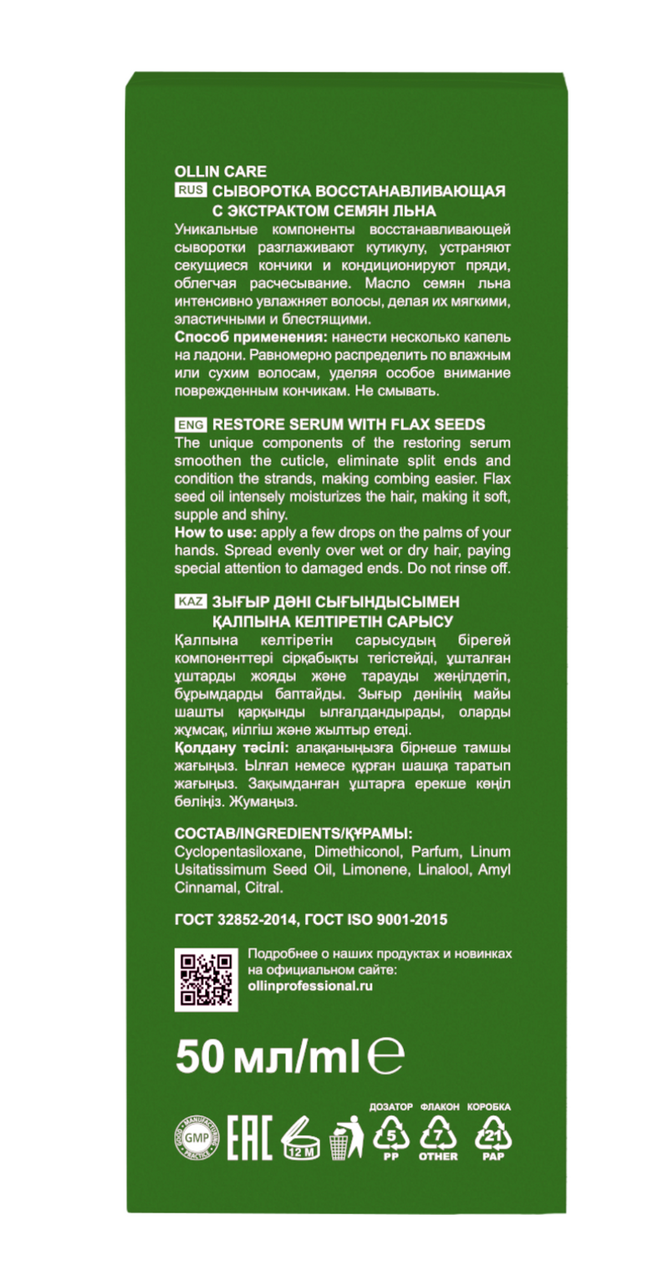 Сыворотка для волос Ollin Care Восстановление с экстрактами семян льна, 50мл