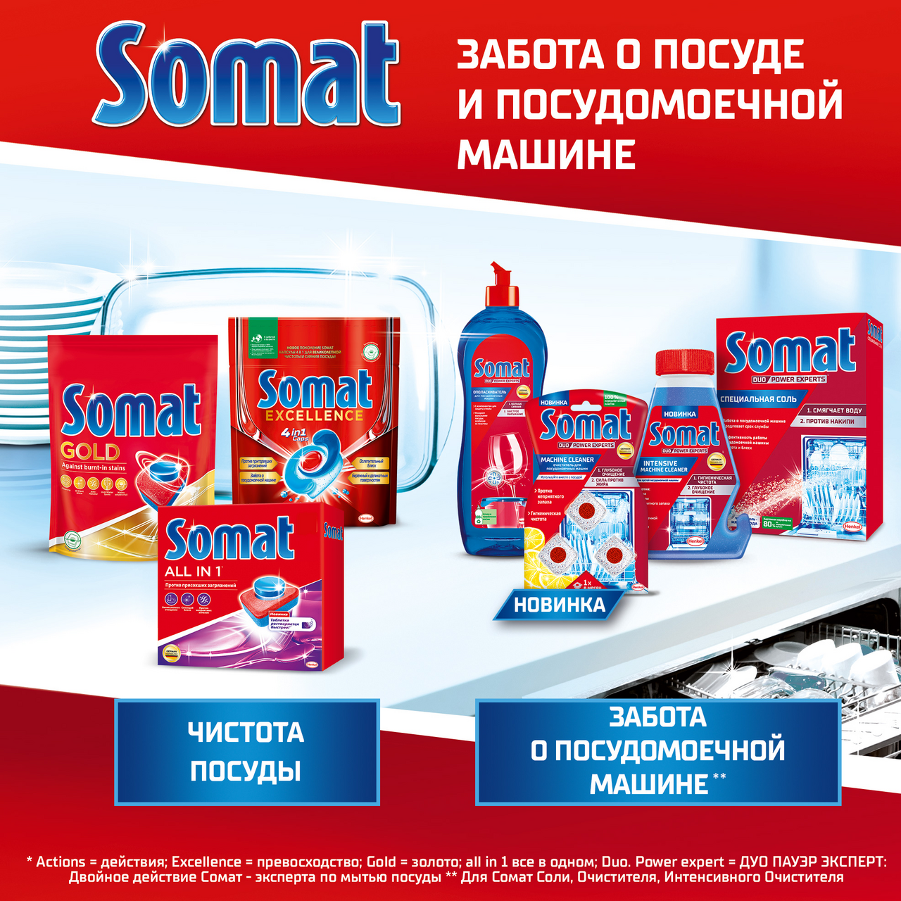 Таблетки для посудомоечной машины Сомат Gold, 72 шт. предназначены для качественного очищения посуды в автоматическом режиме. Для одного цикла достаточно одной порции средства. Оно изготовлено с применением бесфосфатной формулы, которая усилена действием лимонной кислоты, делающей очистку от стойких остатков чая, кофе или накипи более эффективной. Продукт помогает избавиться от застарелых пятен и пригоревших остатков пищи без предварительного замачивания. Таблетки работают в качестве моющего средства, ополаскивателя и обеспечивают защиту стеклянной посуды от образования темного налета. Средство гарантирует отличный результат даже при низкой температуре воды 40 градусов. Хороший эффект достигается при использовании в любой воде: мягкой или жесткой.