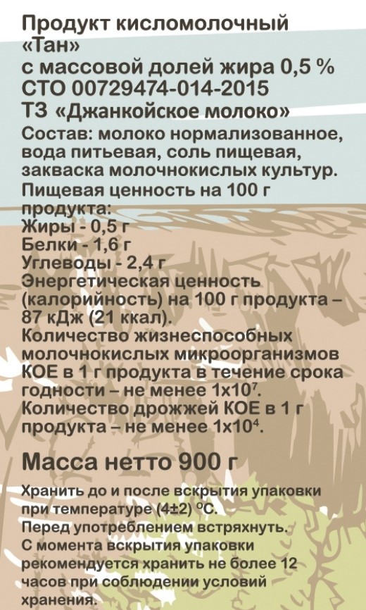 Тан Джанкойское молоко 0.5% жирности – это освежающий и полезный кисломолочный напиток. Удобная упаковка 900г идеально подходит для утоления жажды и поддержания здорового пищеварения. Насладитесь приятным вкусом и легкостью этого традиционного напитка!