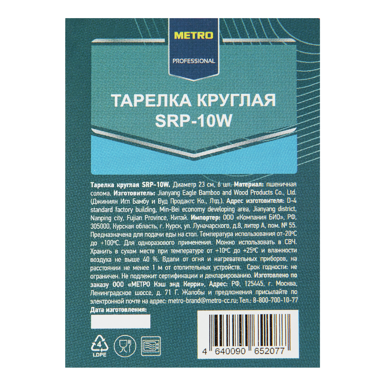 Тарелка METRO PROFESSIONAL - это изделие из экологичного материала (пшеничная солома), предназначеное для подачи еды во время праздников, застолий, пикников. Пшеничная солома биоразлагаема, поэтому использование одноразовой посуды из экоматериалов позволит сократить загрязнение среды пластиком. Диаметр тарелки 23 см.