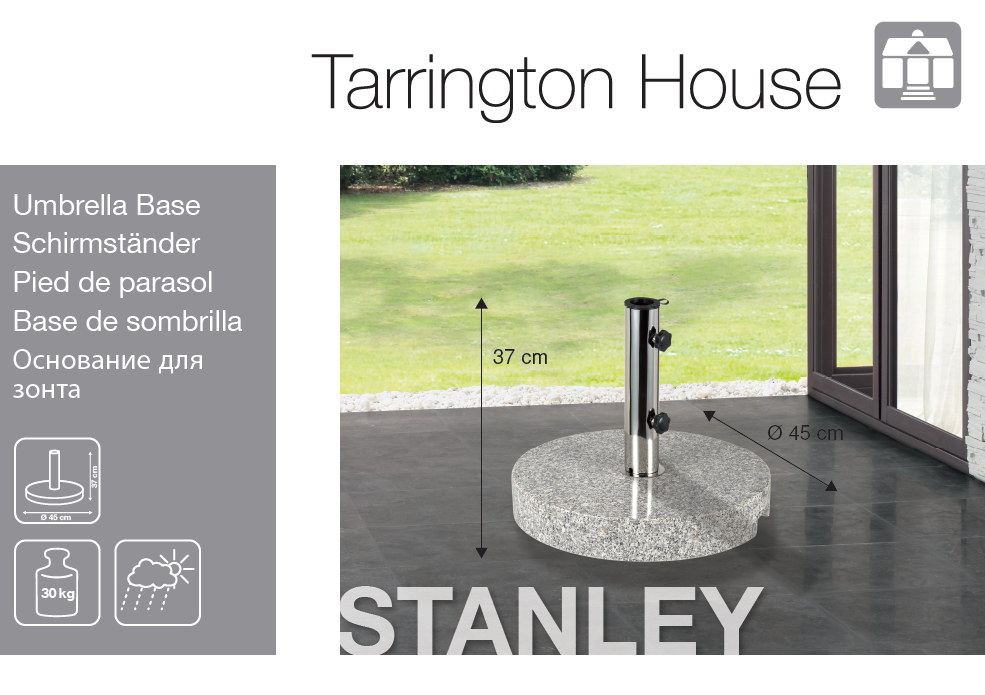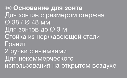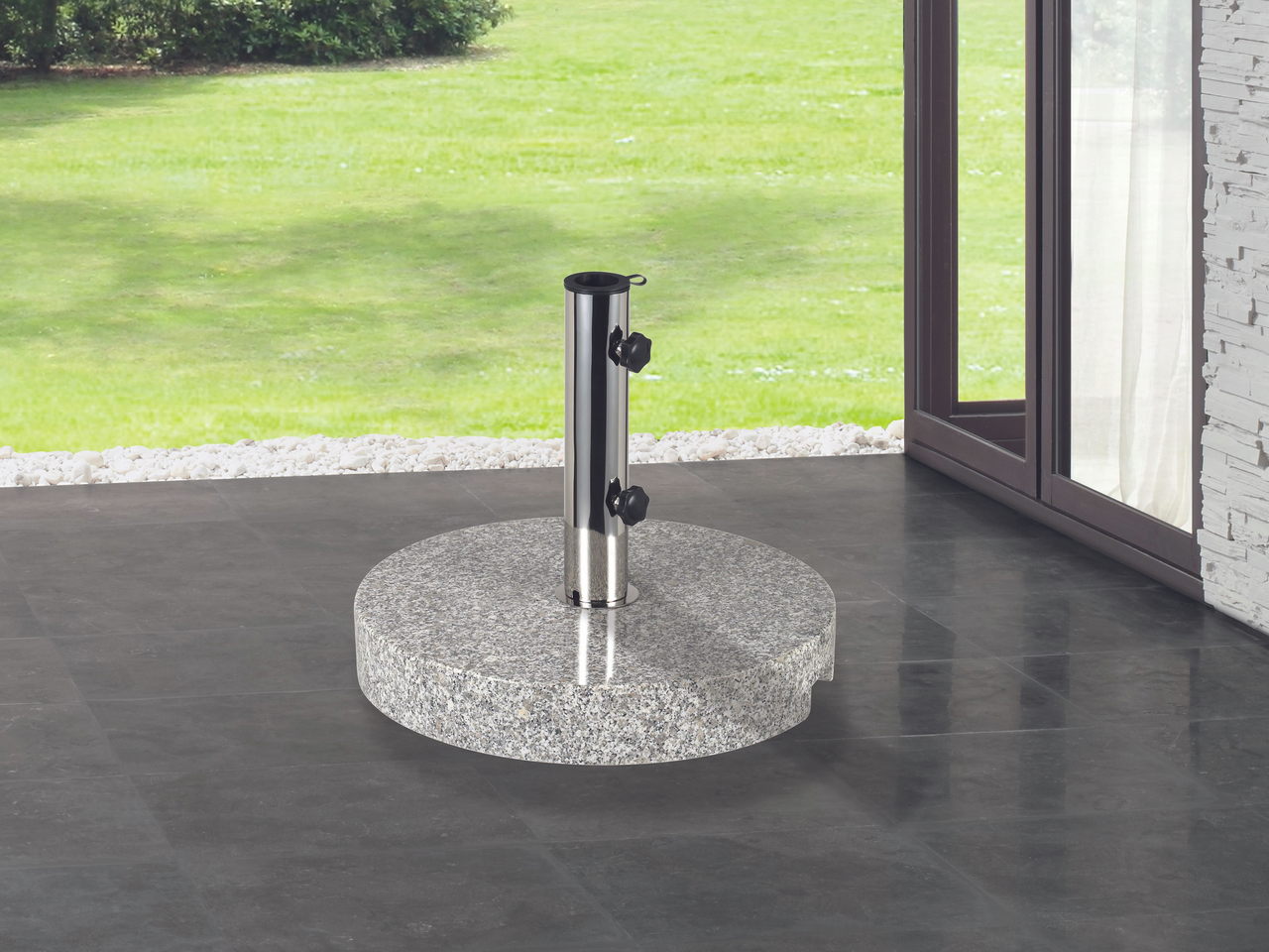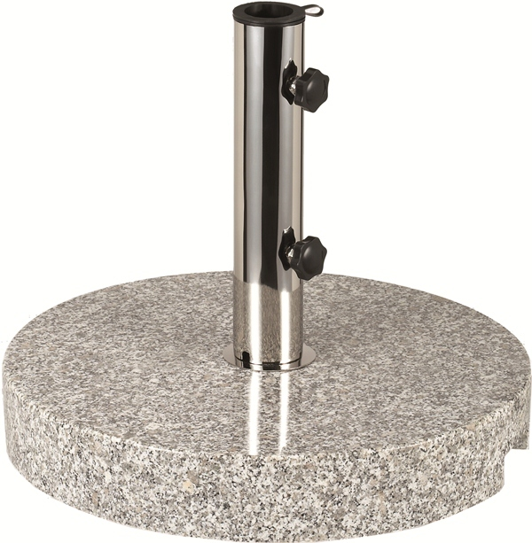 Гранитная подставка для зонта используется для установки садовых зонтов или подвесов. Подставка включает цельную гранитную плиту с удобной ручкой для транспортировки и сдвоенным зажимом для штанги диаметром 38-48 мм. Такая подставка весом 30кг обеспечит устойчивость зонту с большим куполом даже в ветреную погоду.