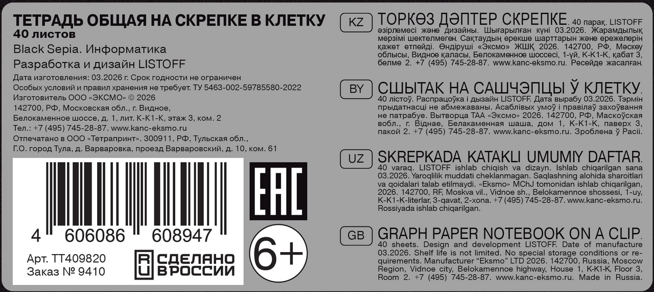 Тетради предметные серии Black Sepia - бюджетная коллекция в трендовом черном цвете и броским дизайном. Современное цветовые решение и стильные элементы непременно придутся по вкусу старшеклассникам, которые шагают в ногу со временем и следят за трендами. Внутри тетради классический внутренний блок, краткая справочная информация. Формат 40 листов в клетку или линию идеально подходит для школьных занятий и домашних заданий. Белая офсетная бумага плотностью 60г/м обеспечивает комфортное письмо без просвечивания чернил. Крепление: скрепка.