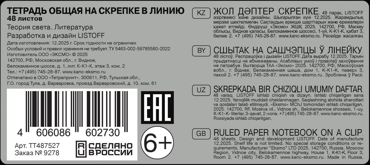 Тетрадь предметная Listoff Теория света Литература А5, 48л