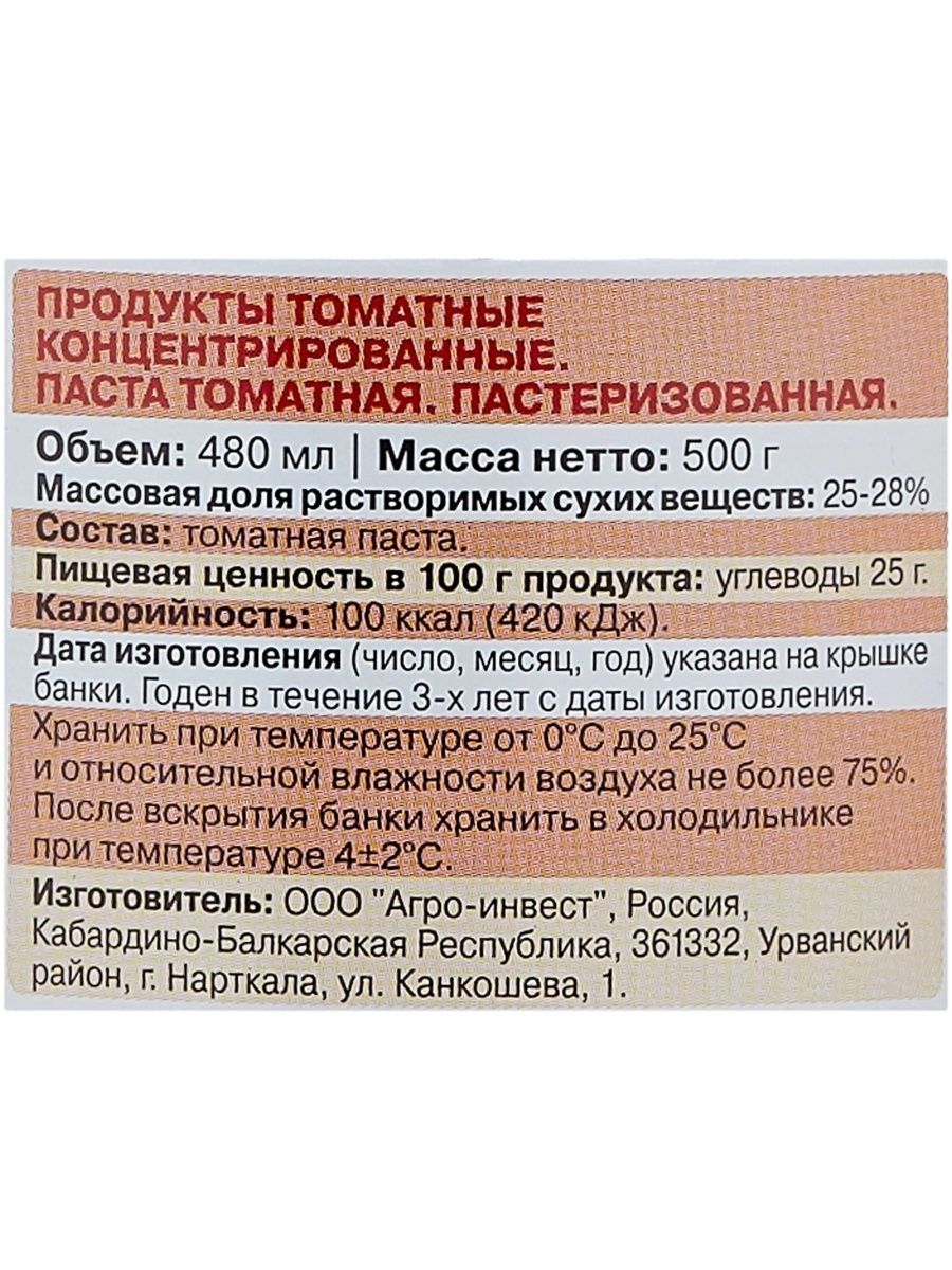Томатная паста Помидорка, 480 г – большая упаковка для тех, кто любит готовить. Продукт приготовлен из натуральных ингредиентов без использования красителей и вредных консервантов, не содержит ГМО и крахмала. Томатная паста – незаменимый ингредиент для создания разнообразных блюд: салатов, супов, пиццы, вторых блюд и различных соусов. Ее особенностью является высокое содержание полезных микроэлементов и витаминов, она богата ликопином, который замедляет процессы старения, а также обладает низкой калорийностью.
