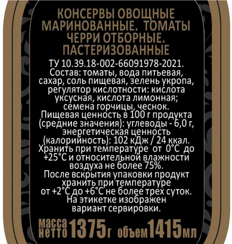 Томаты черри, вода питьевая, сахар, зелень укропа, соль пищевая, регулятор кислотности: кислота уксусная; семена горчицы, чеснок и другие пряности.