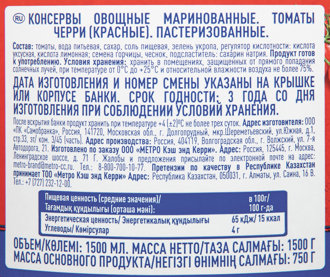 Томаты Metro Chef черри маринованные, 1500 мл обладают оенными вкусовыми качествами. Они отличаются сочной мякотью, насыщенным вкусом и характерным ярким ароматом. Овощи богаты витаминами группы В, Н, РР, А, содержат лимонную, яблочную и винную кислоту, йод, минеральные соли, фосфор, калий, магний и другие необходимые для здоровья микро и макроэлементы. Они способствуют укреплению костной и мышечной ткани, улучшают работу органов сердечно-сосудистой системы и ускоряют обмен веществ, являются профилактикой анемии и мощным природным антиоксидантом. Маринованные томаты можно употреблять в качестве готового блюда, использовать их для приготовления салатов, первых блюд и гарниров к мясу, птице или рыбе.